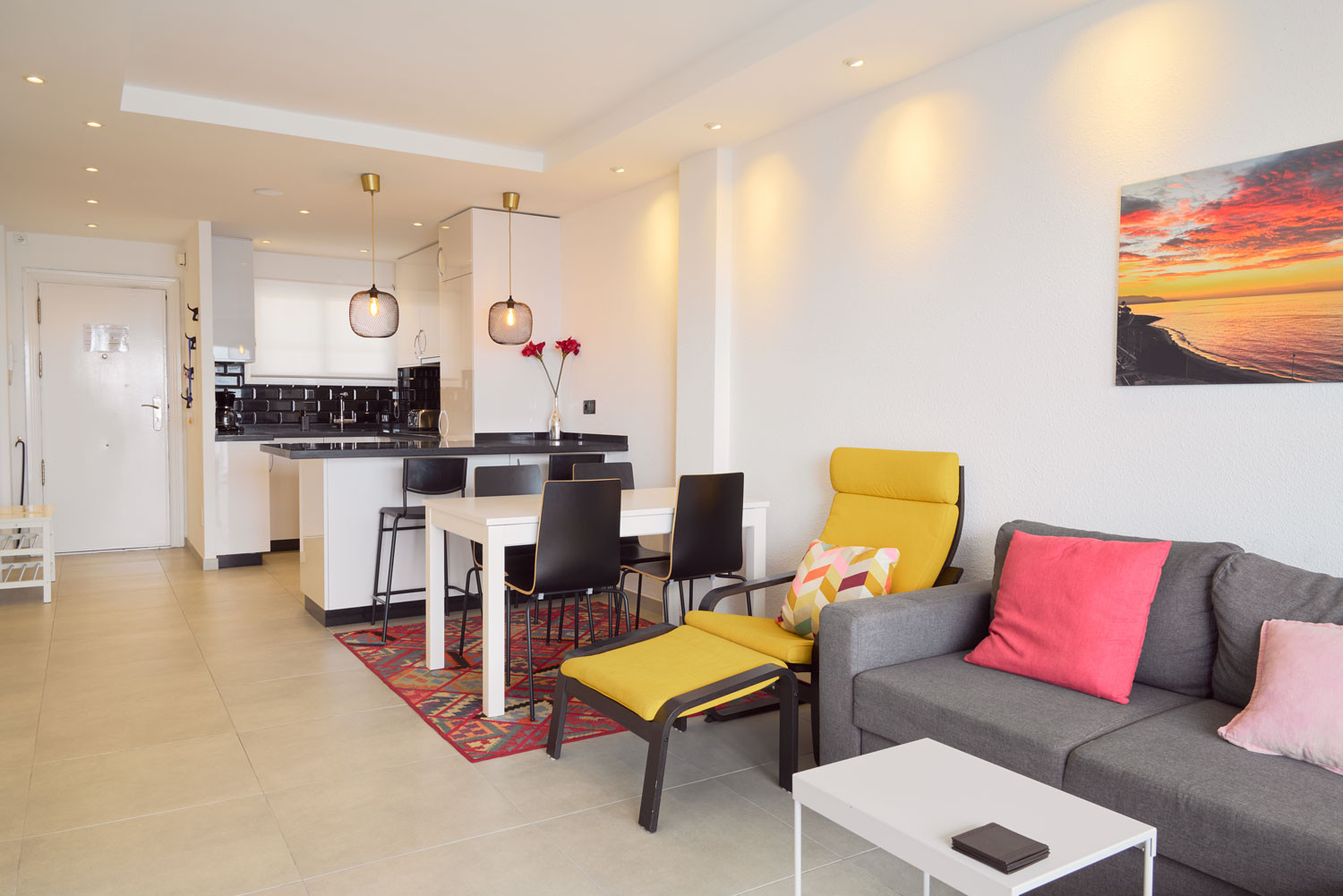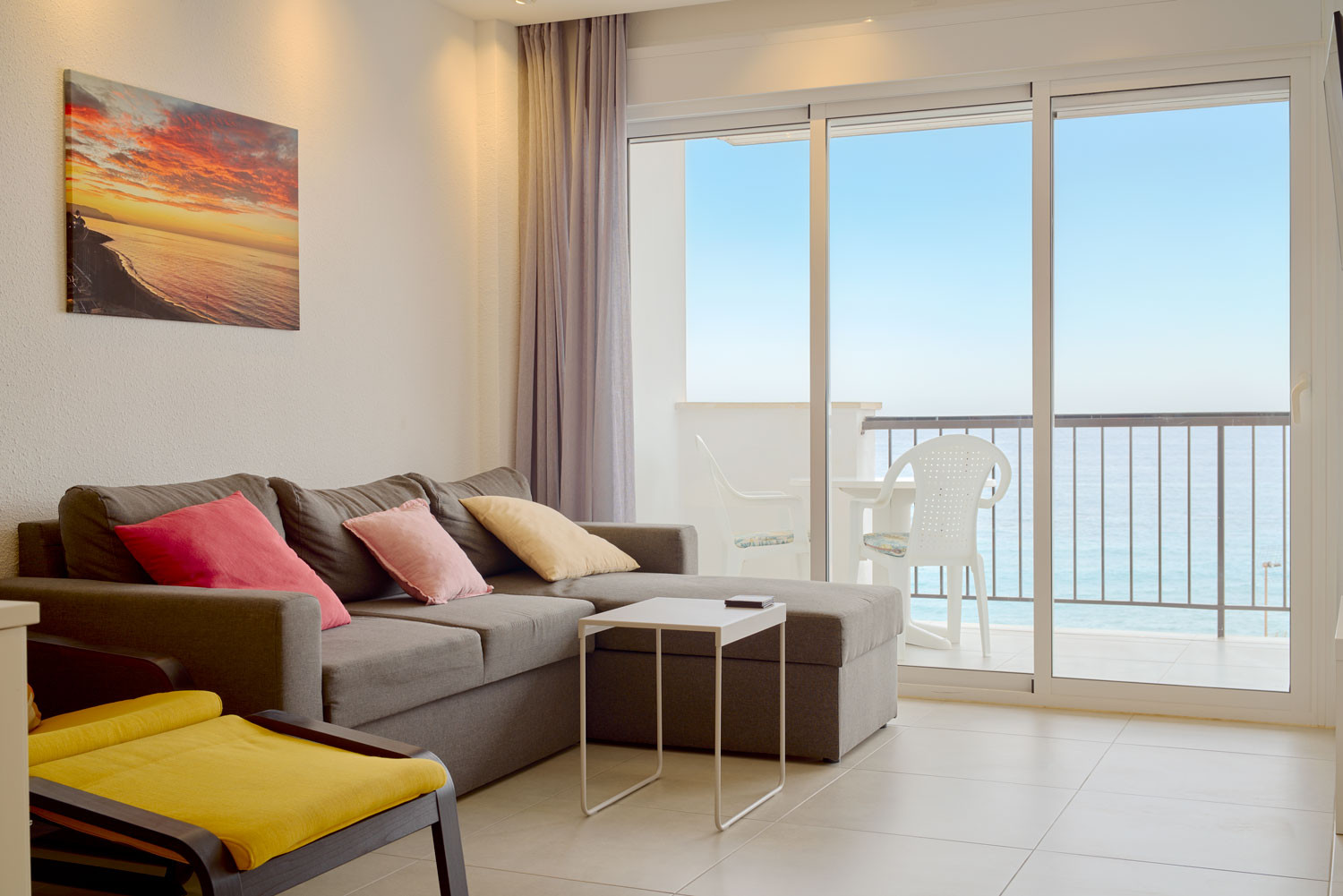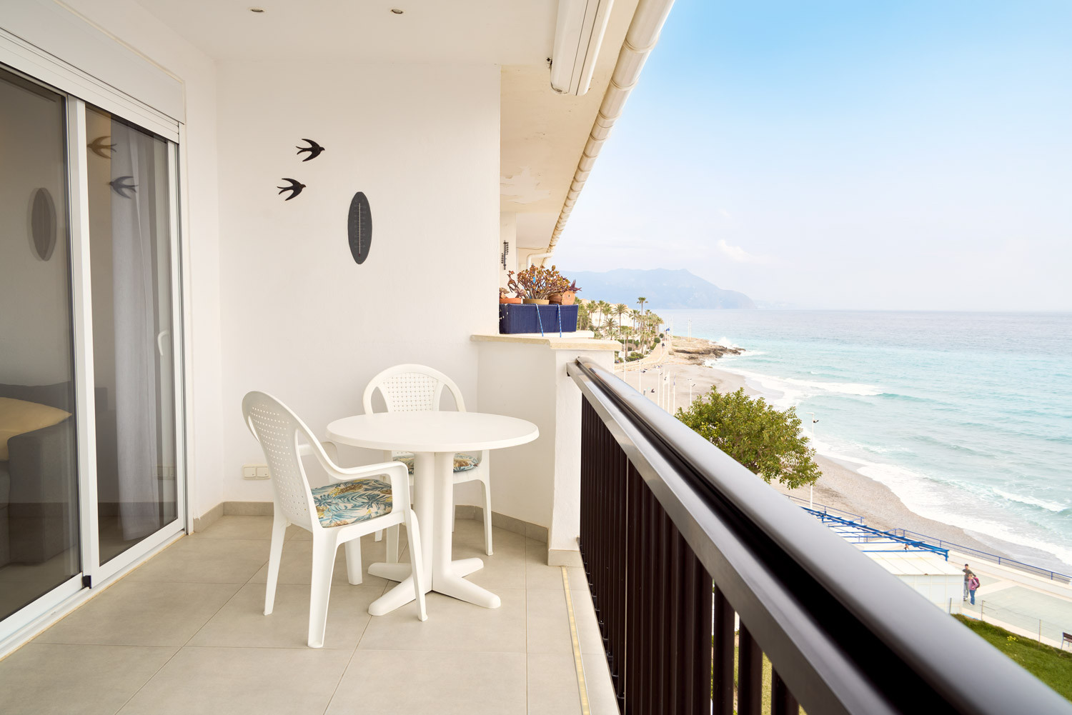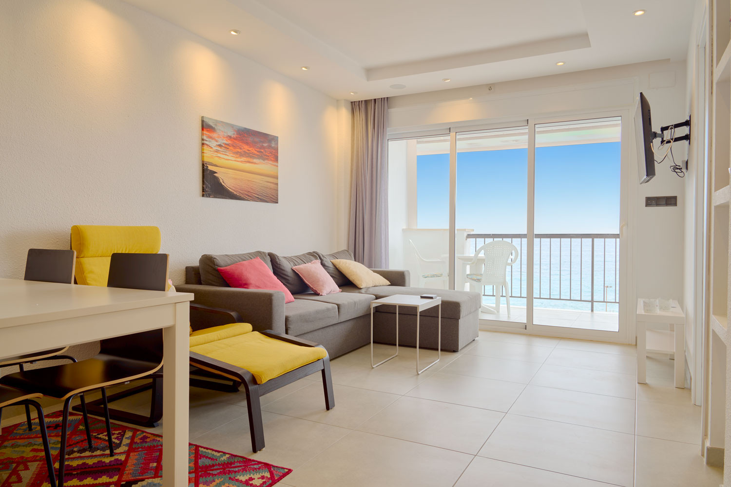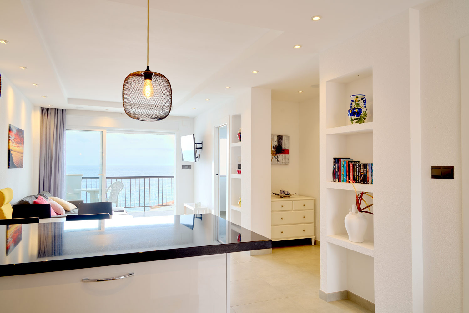 Desde el mismo momento en que se entra al alojamiento, el mar se convierte en el protagonista absoluto. La sensación de estar suspendido sobre el Mediterráneo es inmediata al cruzar el umbral; la distribución de la sala de estar está diseñada para que el azul del horizonte parezca una extensión del propio suelo. Es un espacio con una luminosidad excepcional, ideal para quienes buscan una desconexión visual total. Además, su ubicación es inmejorable para olvidarse del coche, situándose a menos de 100 metros de la Playa de la Torrecilla, apenas un minuto a pie.Distribución funcional y diseño orientado al exterior