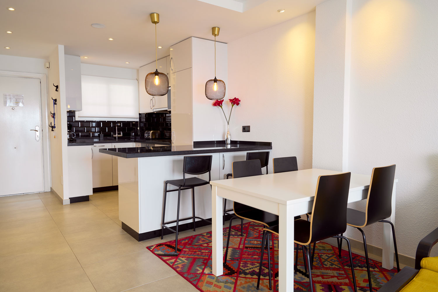 El apartamento tiene capacidad para 4 personas y una disposición muy cómoda. Al entrar, a la izquierda se ubica la cocina con mesa tipo barra americana,que se integra en un salón-comedor equipado con Wi-Fi de alta velocidad y TV. El área de descanso se organiza con un dormitorio de dos camas individuales, un aseo y un baño principal con plato de ducha. El dormitorio principal cuenta con cama doble y vistas al mar, permitiendo despertar con el sonido de las olas.Terraza privada y zona de baño