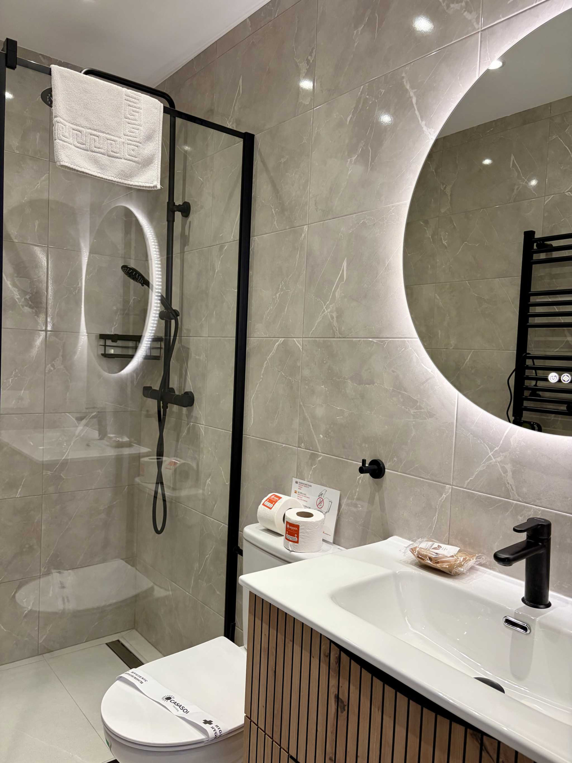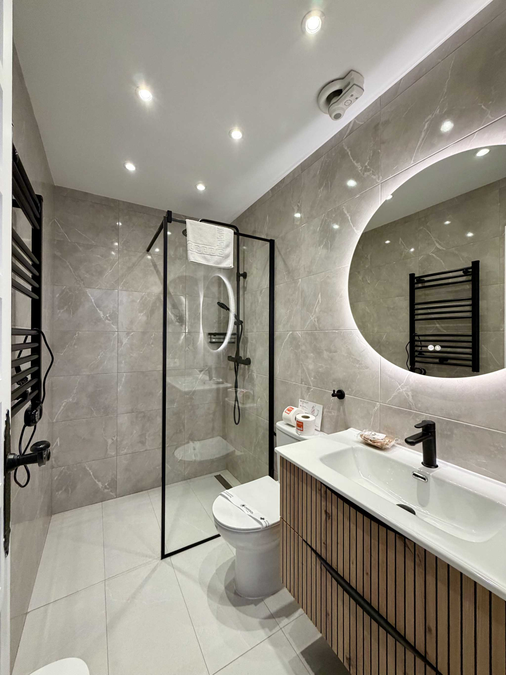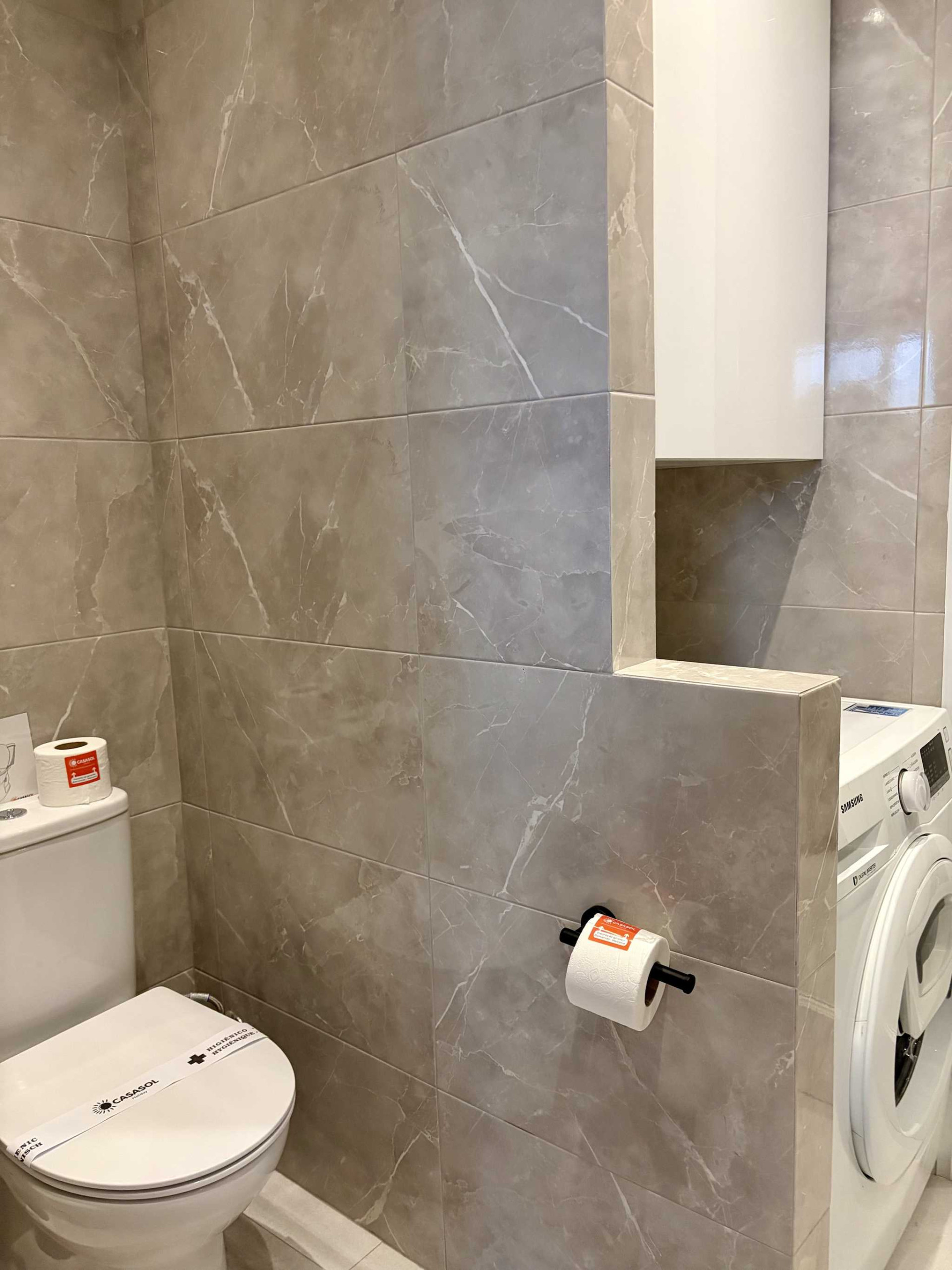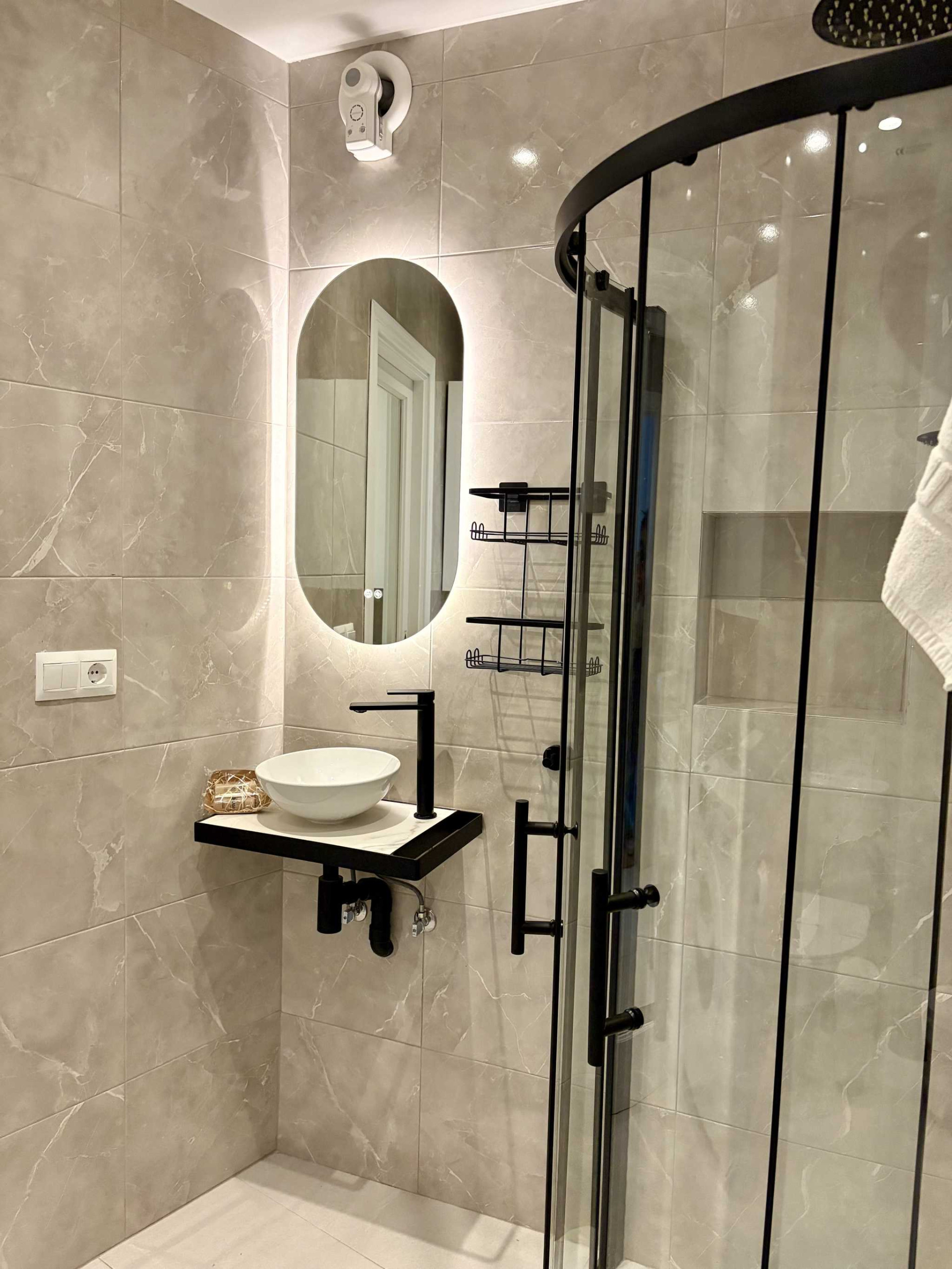 - Un segundo cuarto de baño moderno accesible desde el pasillo con ducha, aseo y elegantes acabados.