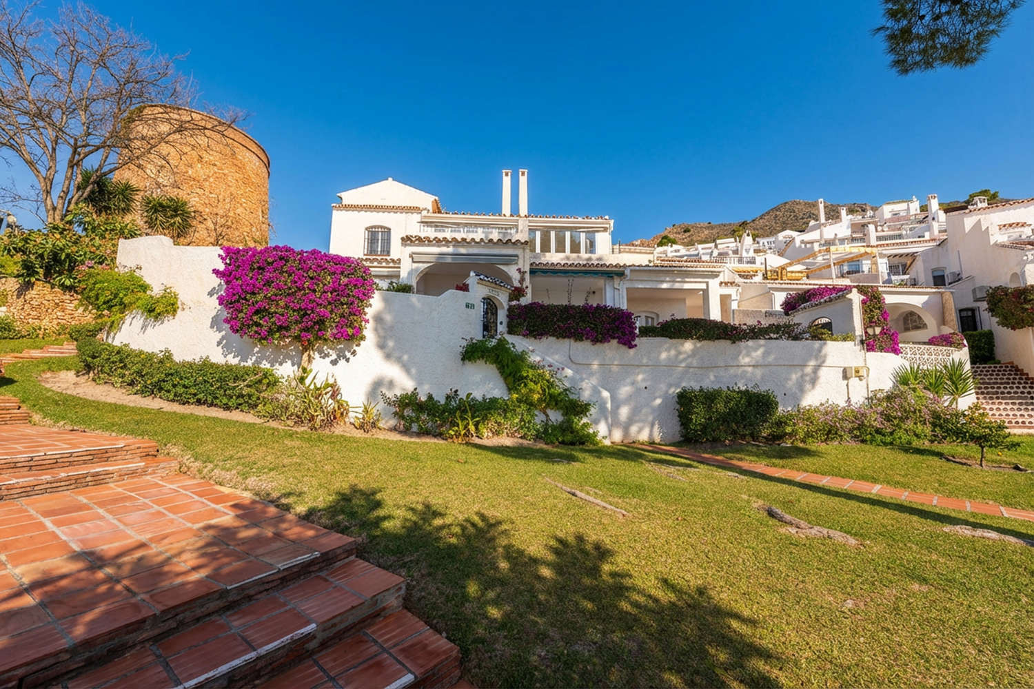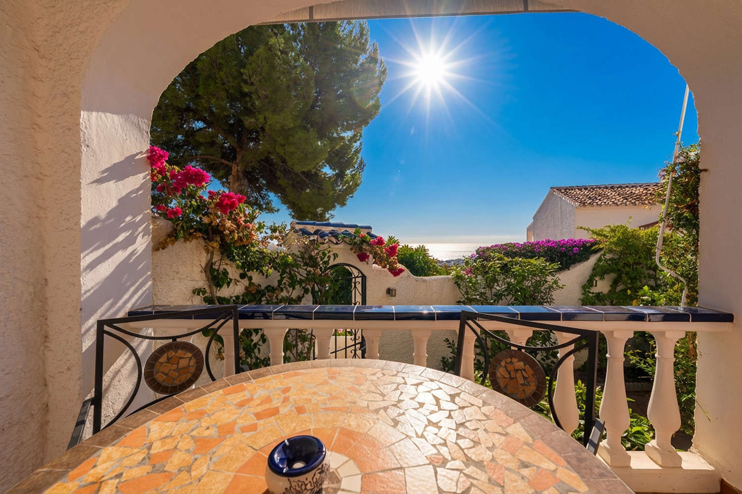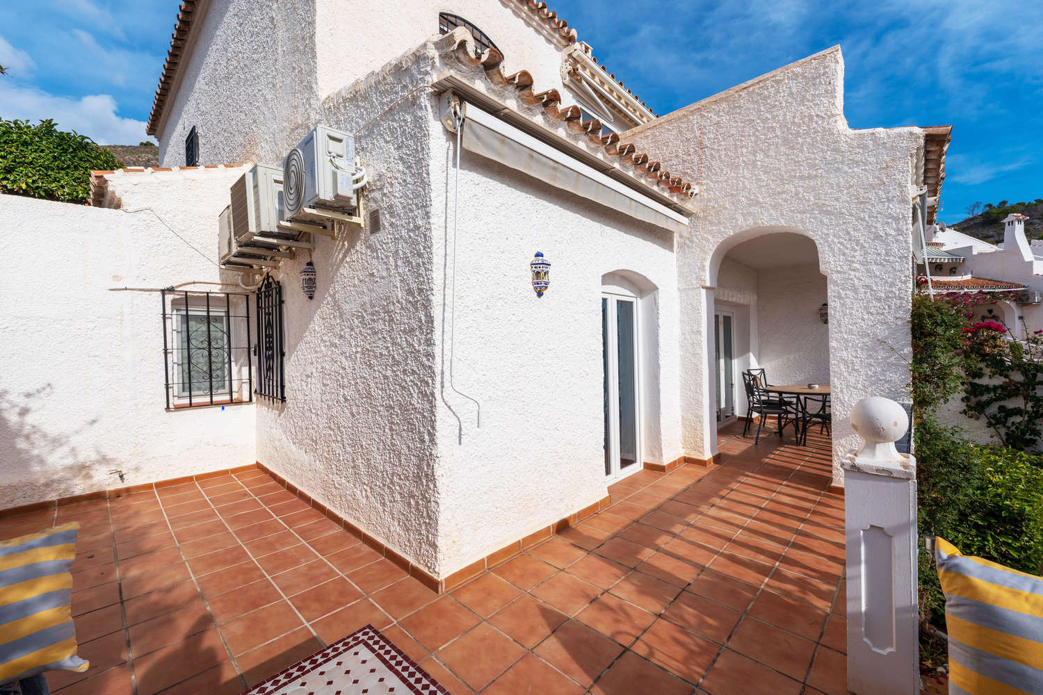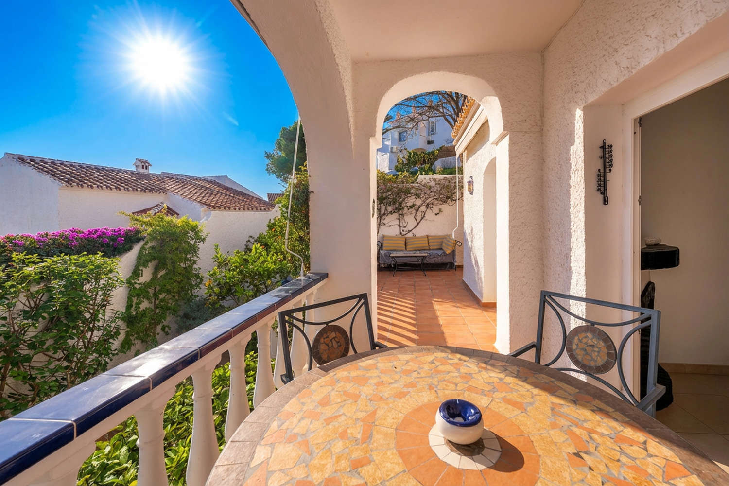 La terraza es el espacio más valorado de la propiedad, equipada con sofá y mesa de comedor para disfrutar del microclima de Nerja durante todo el año. Al estar envuelta por plantas y flores, ofrece una privacidad natural que invita a largas sobremesas. Los huéspedes tienen acceso al exclusivo complejo de piscinas de la urbanización, que incluye una piscina infantil segura para los más pequeños, zonas de césped y un restaurante con panorámicas de toda la bahía.Por qué elegir Casa Tranquila para tus vacaciones