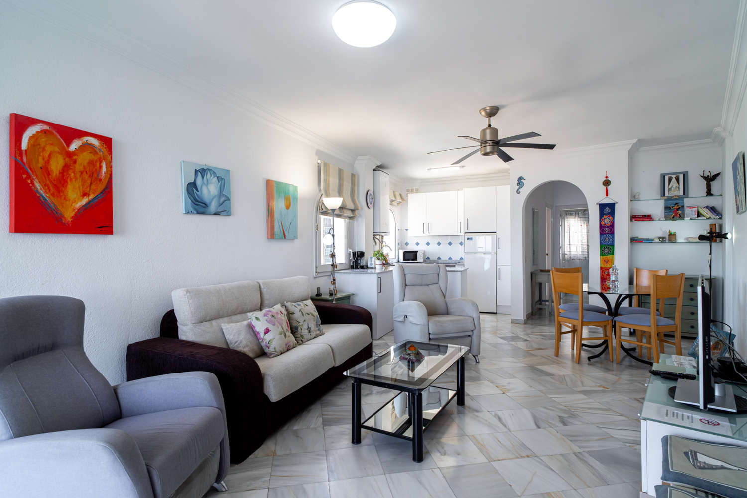 Desde la acogedora terraza orientada al sur, disfruta de las impresionantes vistas del mar Mediterráneo, creando el escenario perfecto para relajarte y disfrutar del clima soleado durante todo el año. Además, tendrás acceso directo a la piscina comunitaria, que está abierta durante todas las estaciones, para que puedas darte un chapuzón refrescante en cualquier momento.