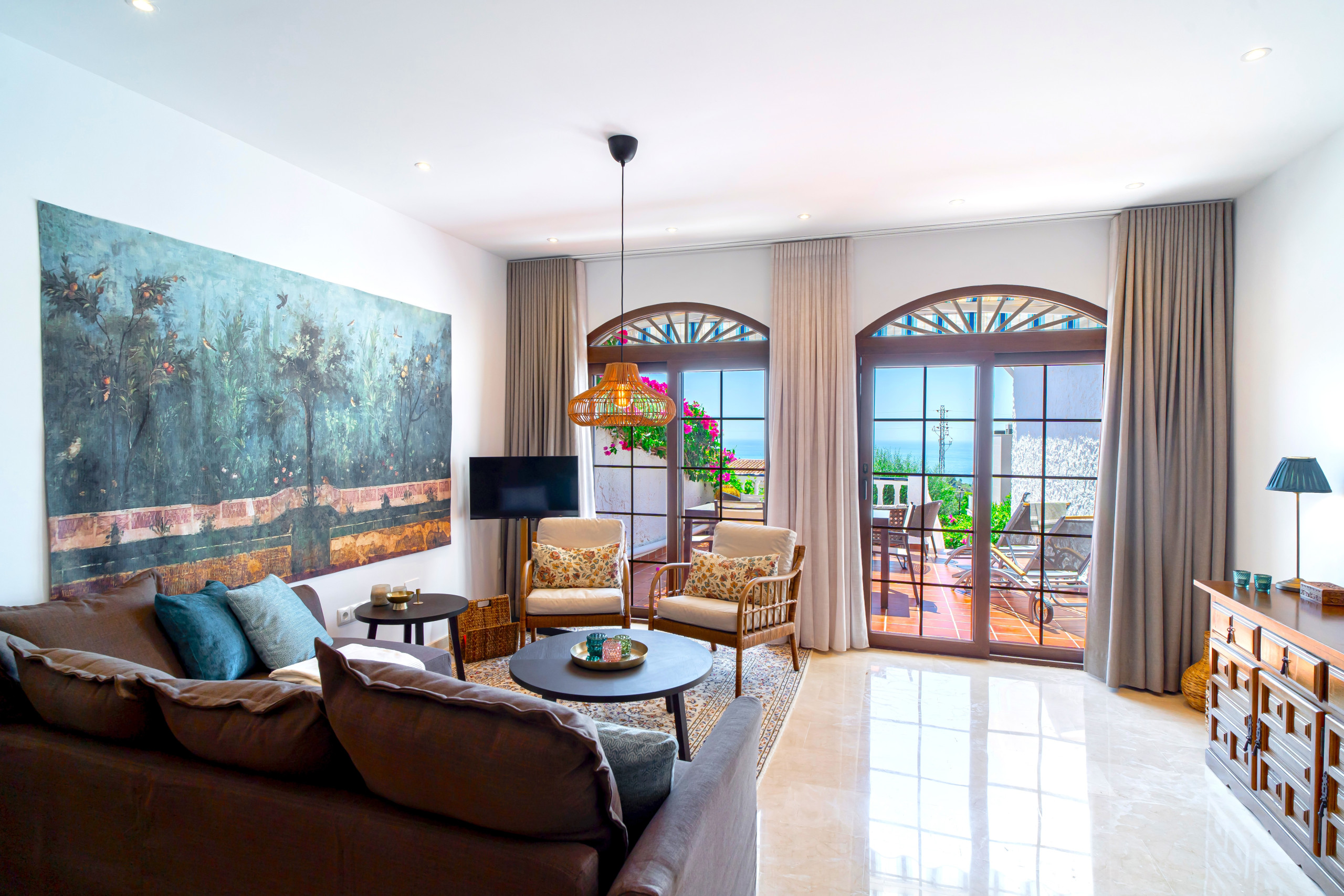 Desde la sala de estar se puede salir a la terraza orientada al sur, cuidadosamente amueblada con una zona de comedor y tumbonas, un lugar ideal para comer al aire libre o simplemente tomar el sol. Unos pocos escalones conducen a un acogedor rincón de salón rodeado de vibrantes buganvillas y exuberantes flores del jardín, creando un refugio tranquilo y acogedor.