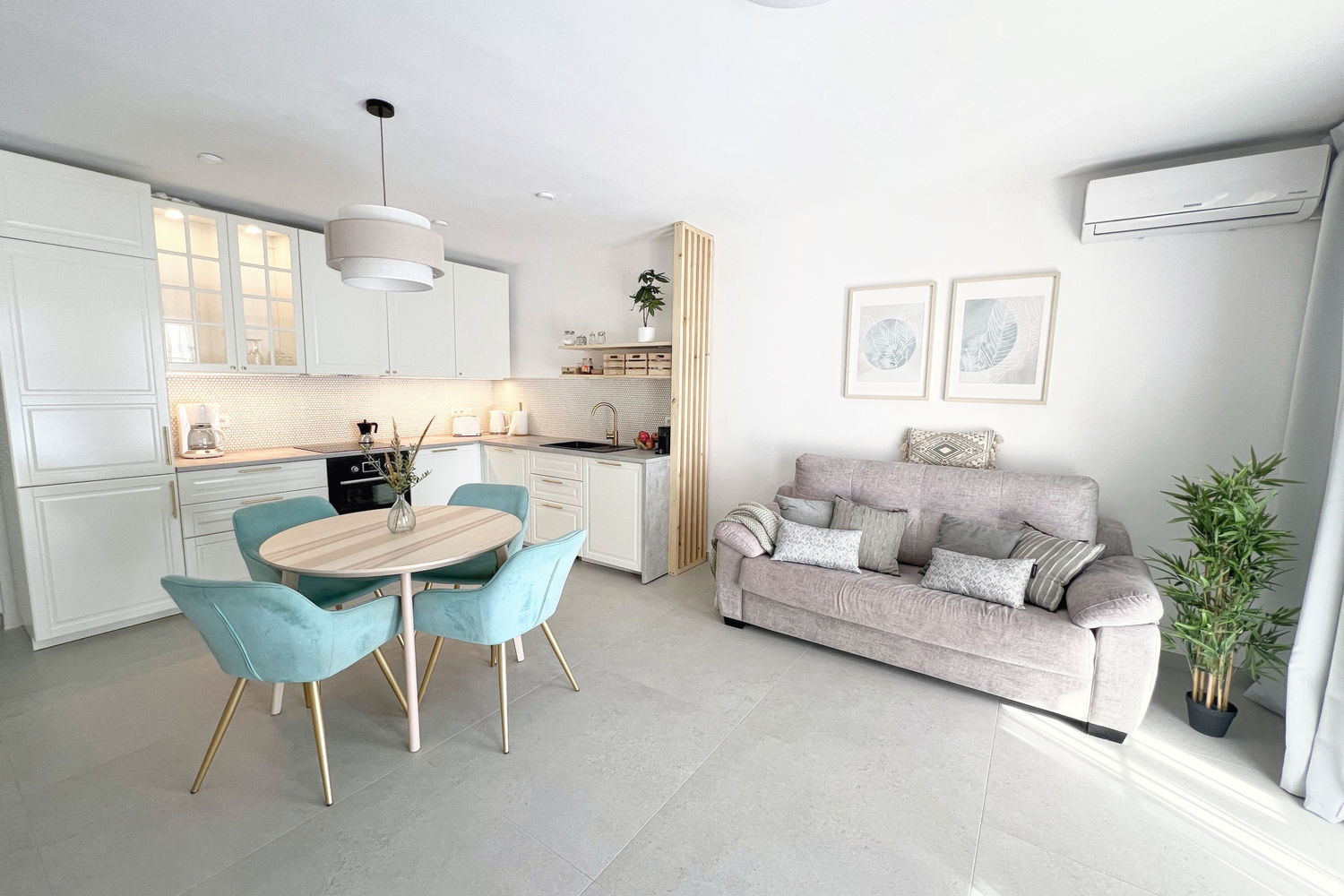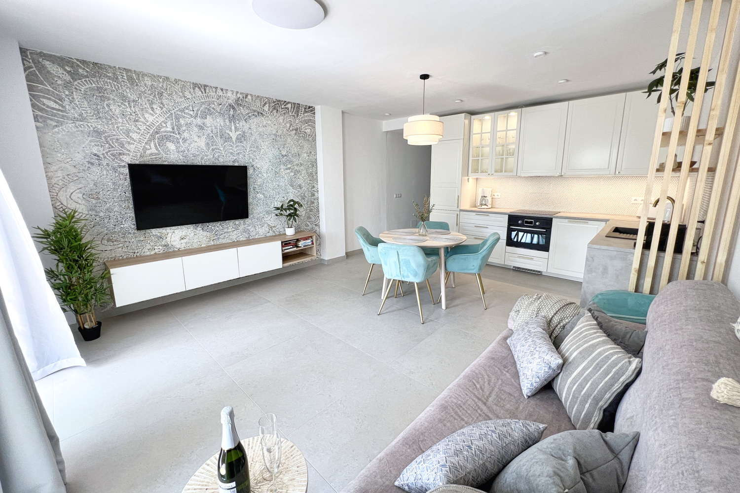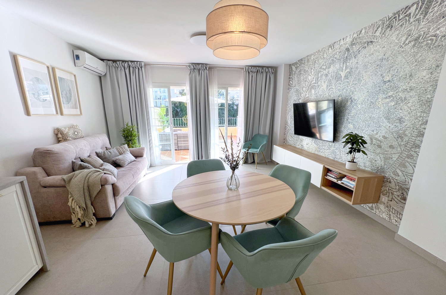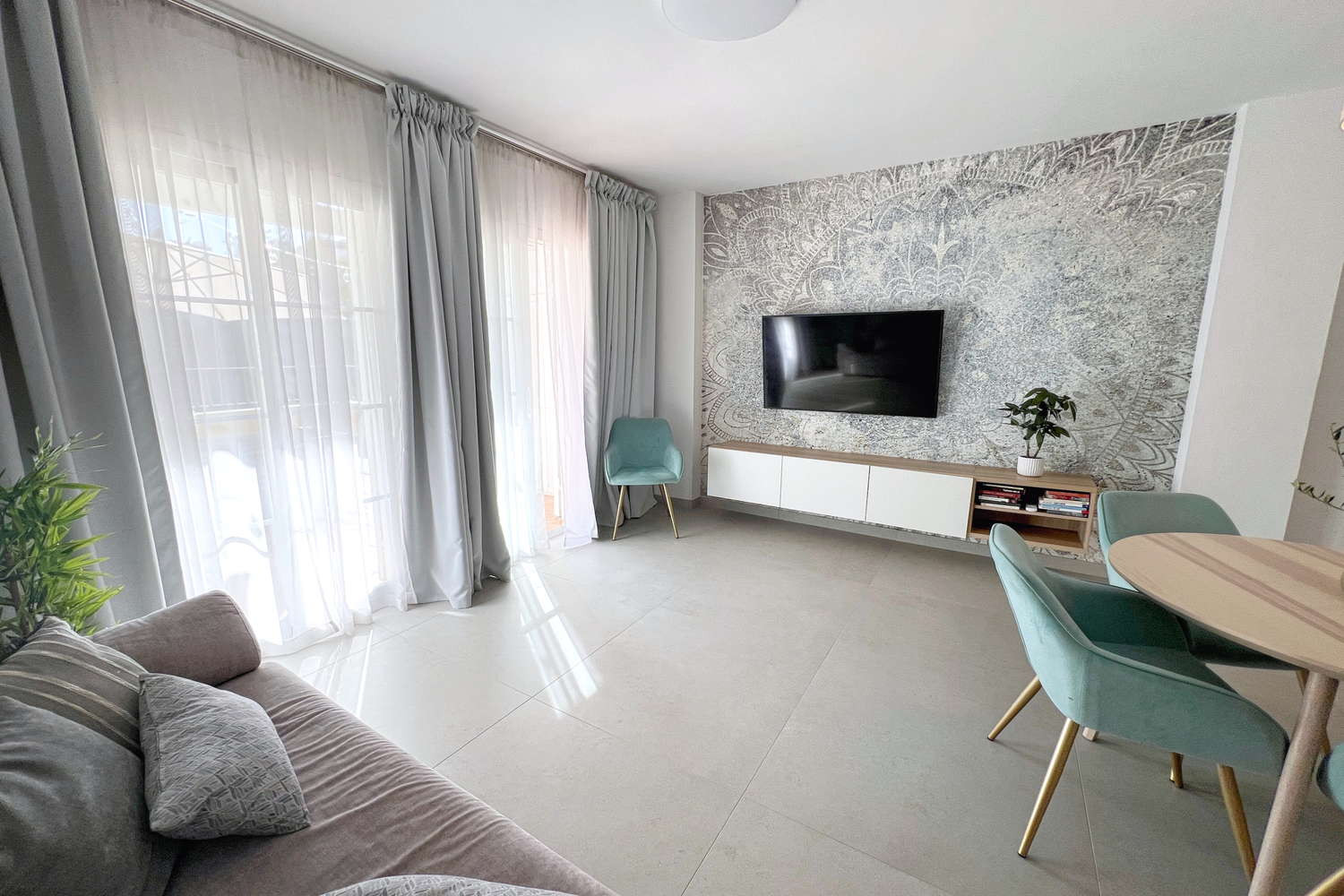 Vida interior: El amplio salón ofrece un ambiente acogedor con televisión de gran tamaño y conexión a internet de alta velocidad, perfecto para relajarse tras un día de playa.