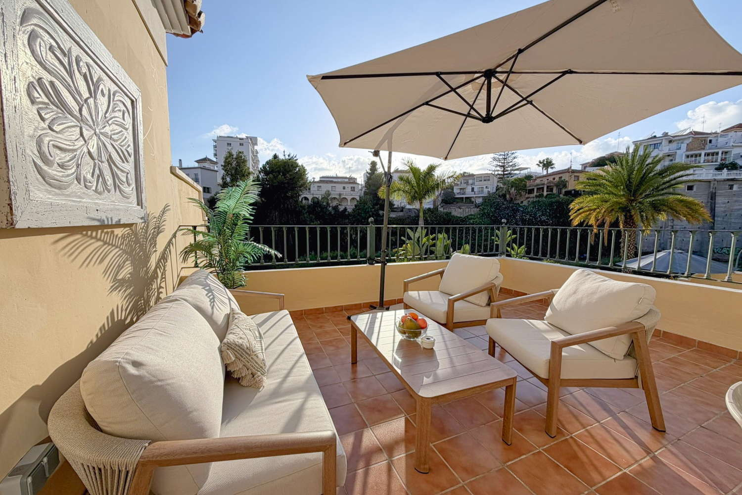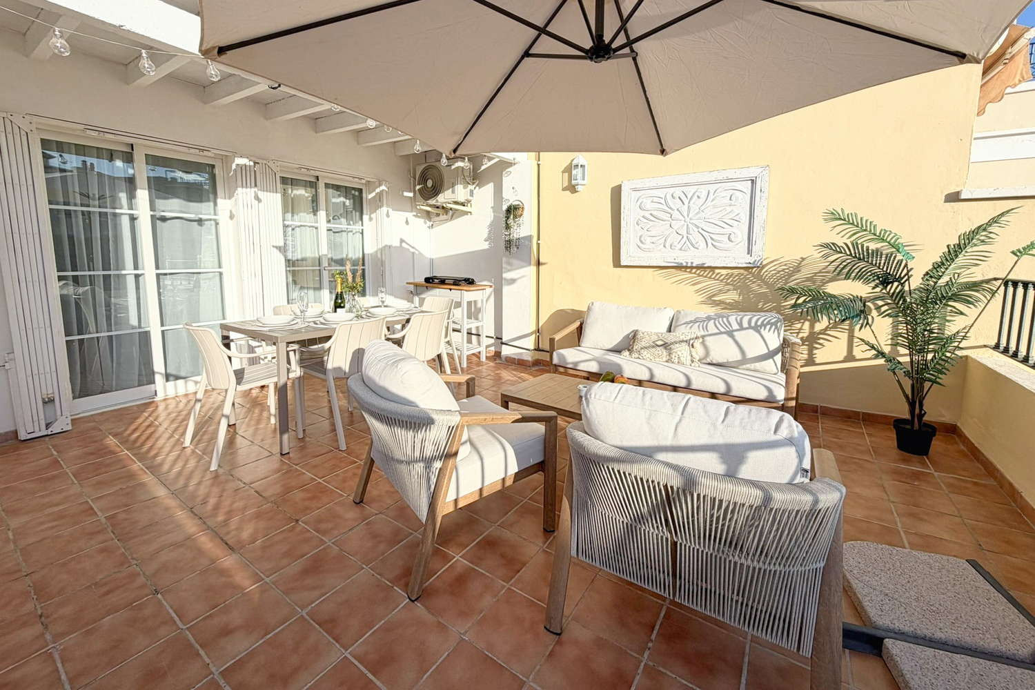 Terraza privada: Desde el salón se accede a una terraza privada de 25 m² equipada con sofá tipo lounge, perfecta para disfrutar del aire libre, desayunar o cenar tranquilamente.