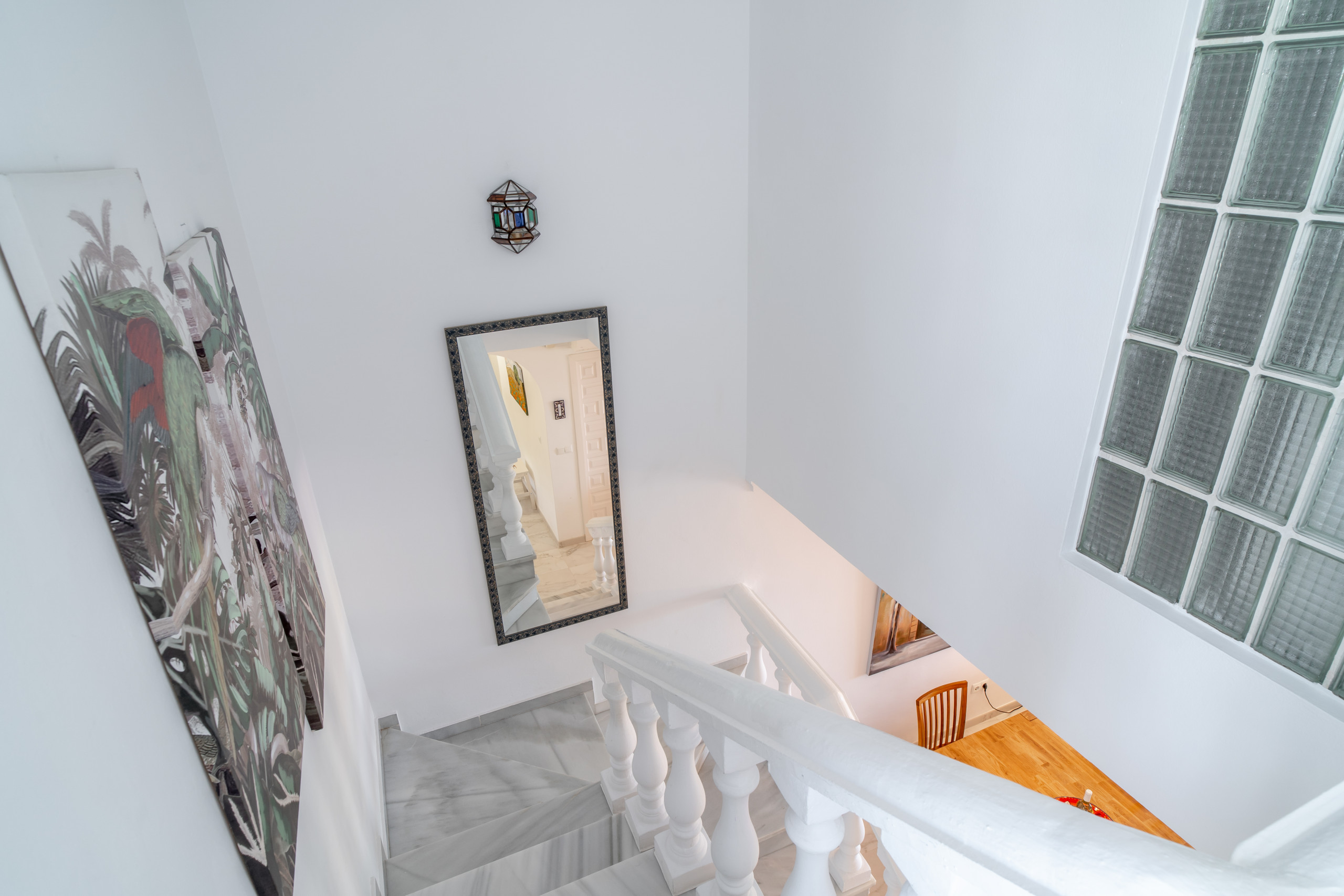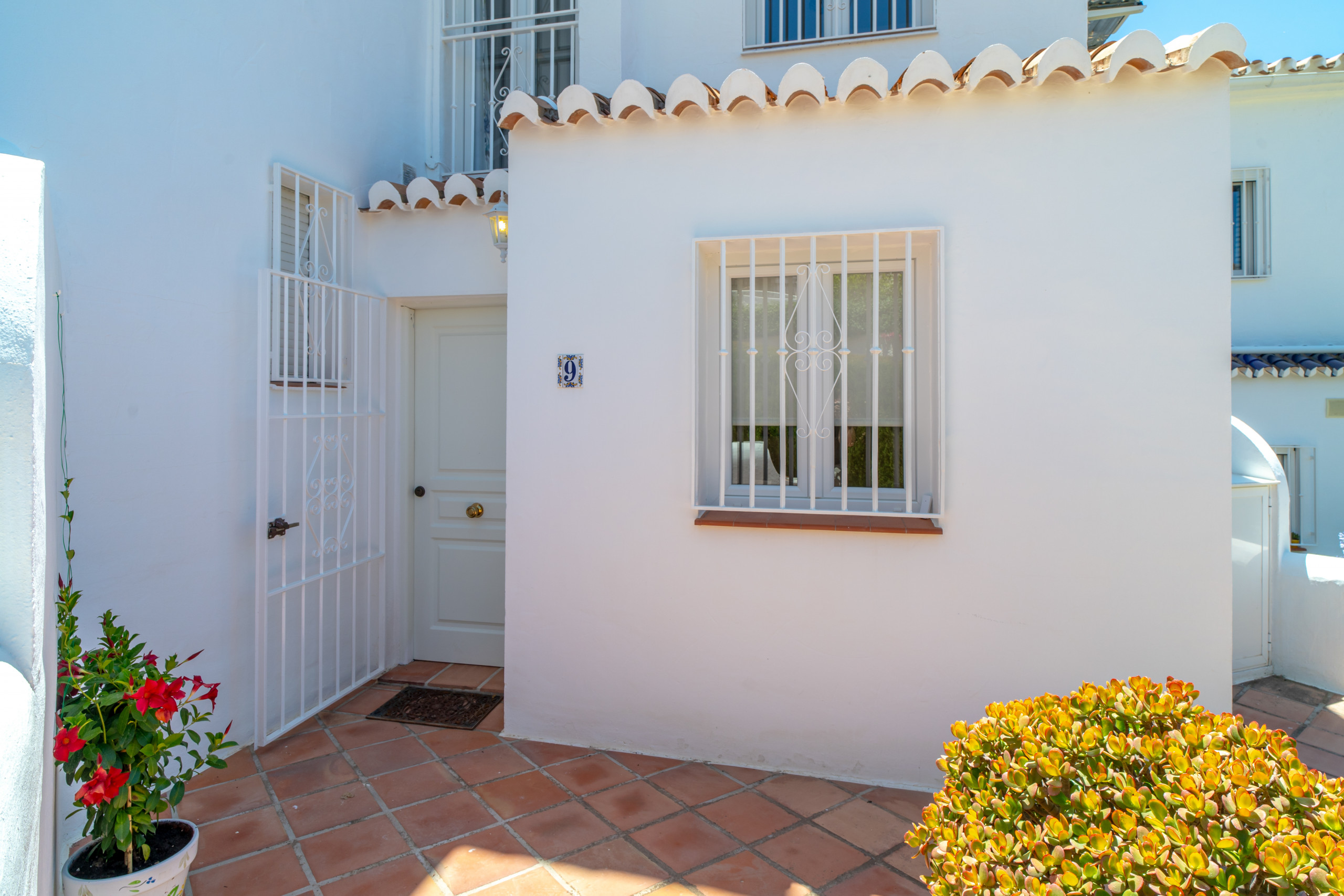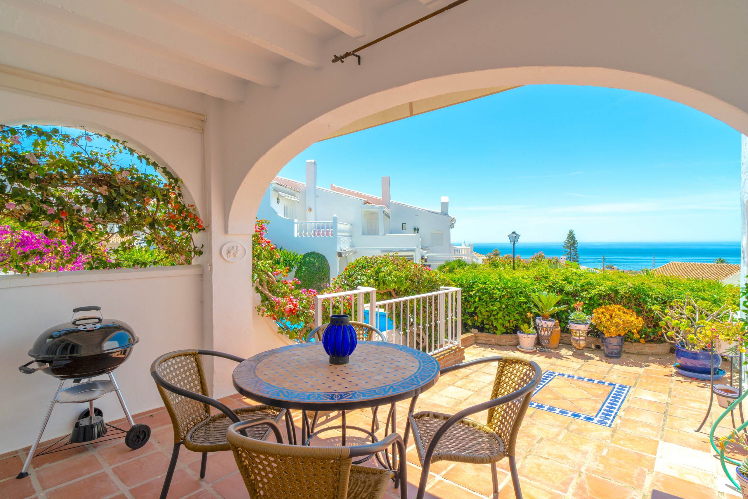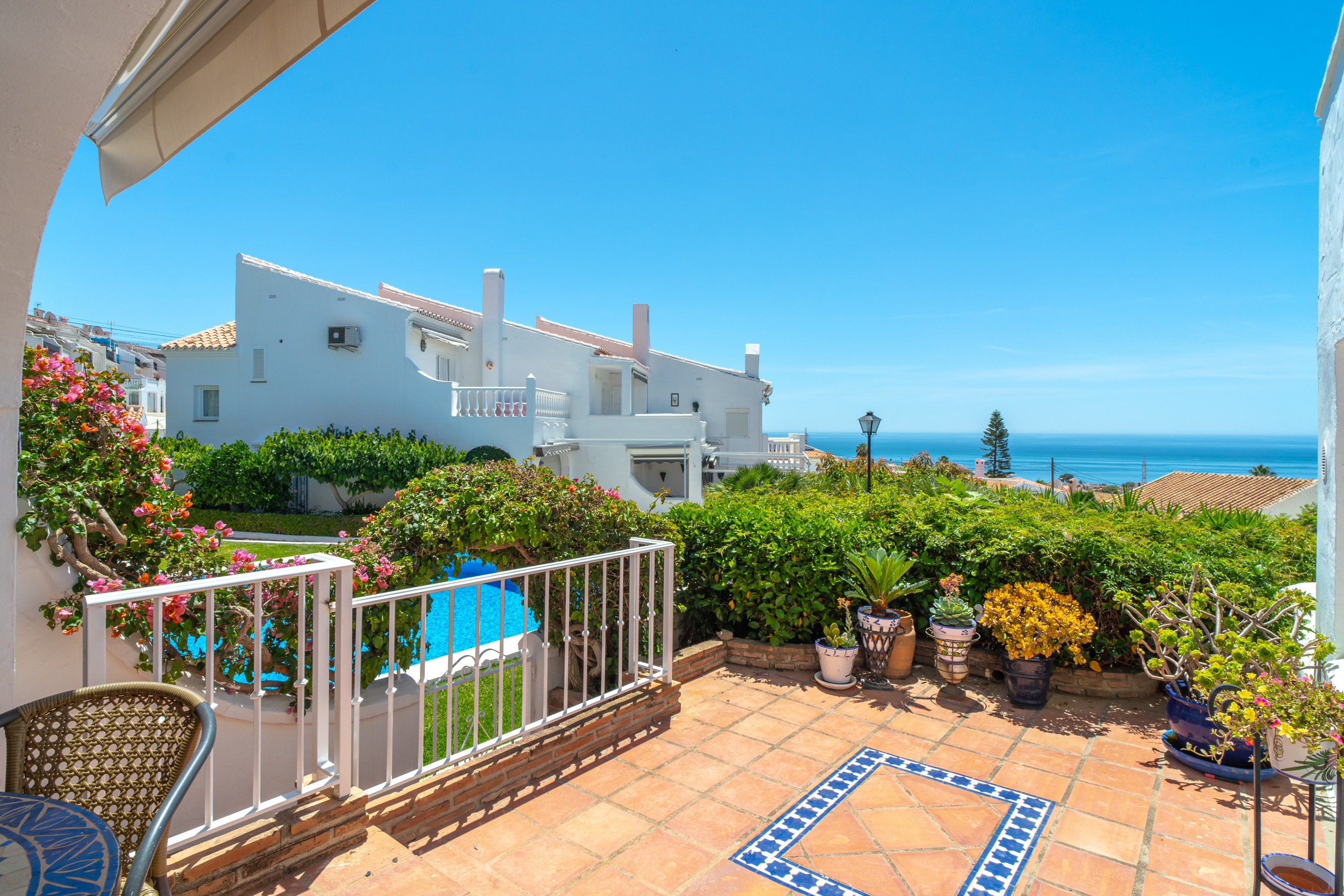 La propiedad cuenta con una acogedora terraza parcialmente cubierta en la planta baja, un espacio ideal para disfrutar de un almuerzo a la sombra, cenar al aire libre o simplemente relajarse con una copa de vino mientras se contempla la vista. Esta terraza dispone además de su propio pequeño jardín privado con plantas en macetas, buganvillas, hibiscos y jazmines, que se complementa perfectamente con el exuberante jardín comunitario que rodea la vivienda. Para su comodidad, ambas terrazas están equipadas con toldos eléctricos para proporcionar sombra siempre que sea necesario.