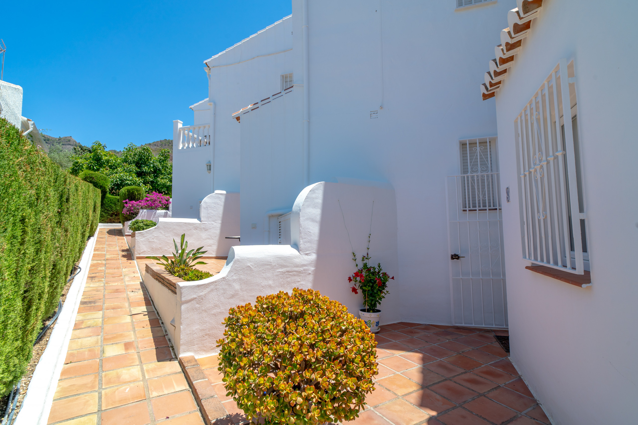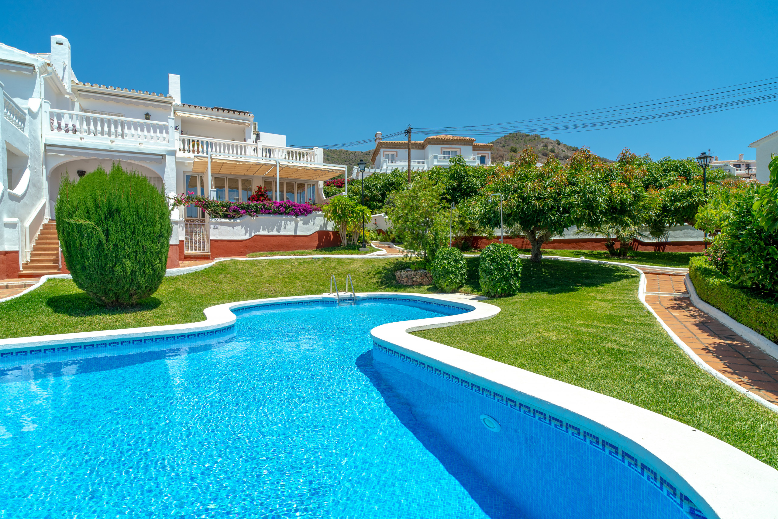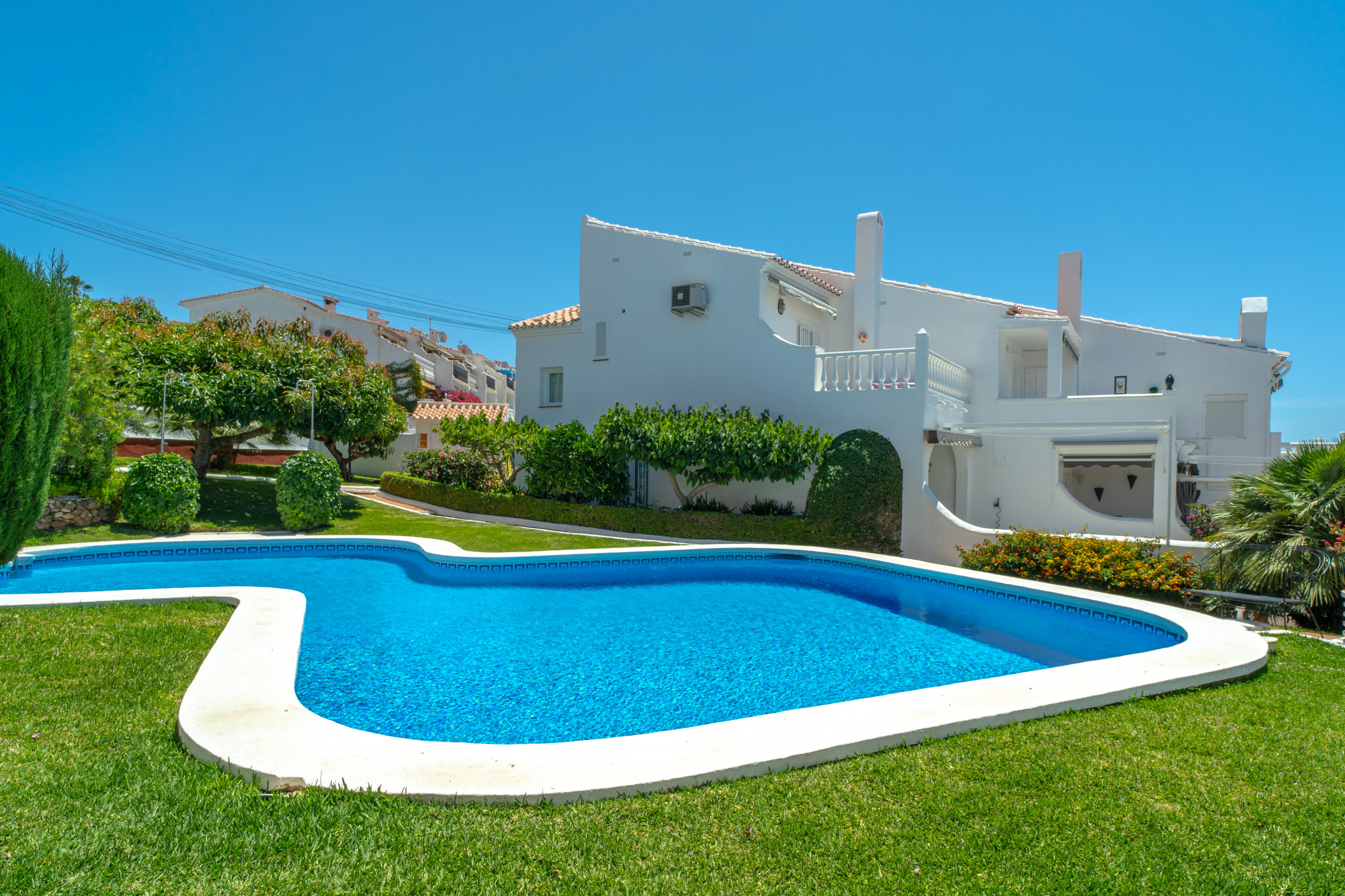 La urbanización es un paraíso botánico meticulosamente cuidado, con un extenso jardín comunitario lleno de flores, plantas y árboles de aguacate. La piscina está rodeada por las casas y amplias zonas verdes. Incluso durante la temporada alta, el aparcamiento es fácil de encontrar.