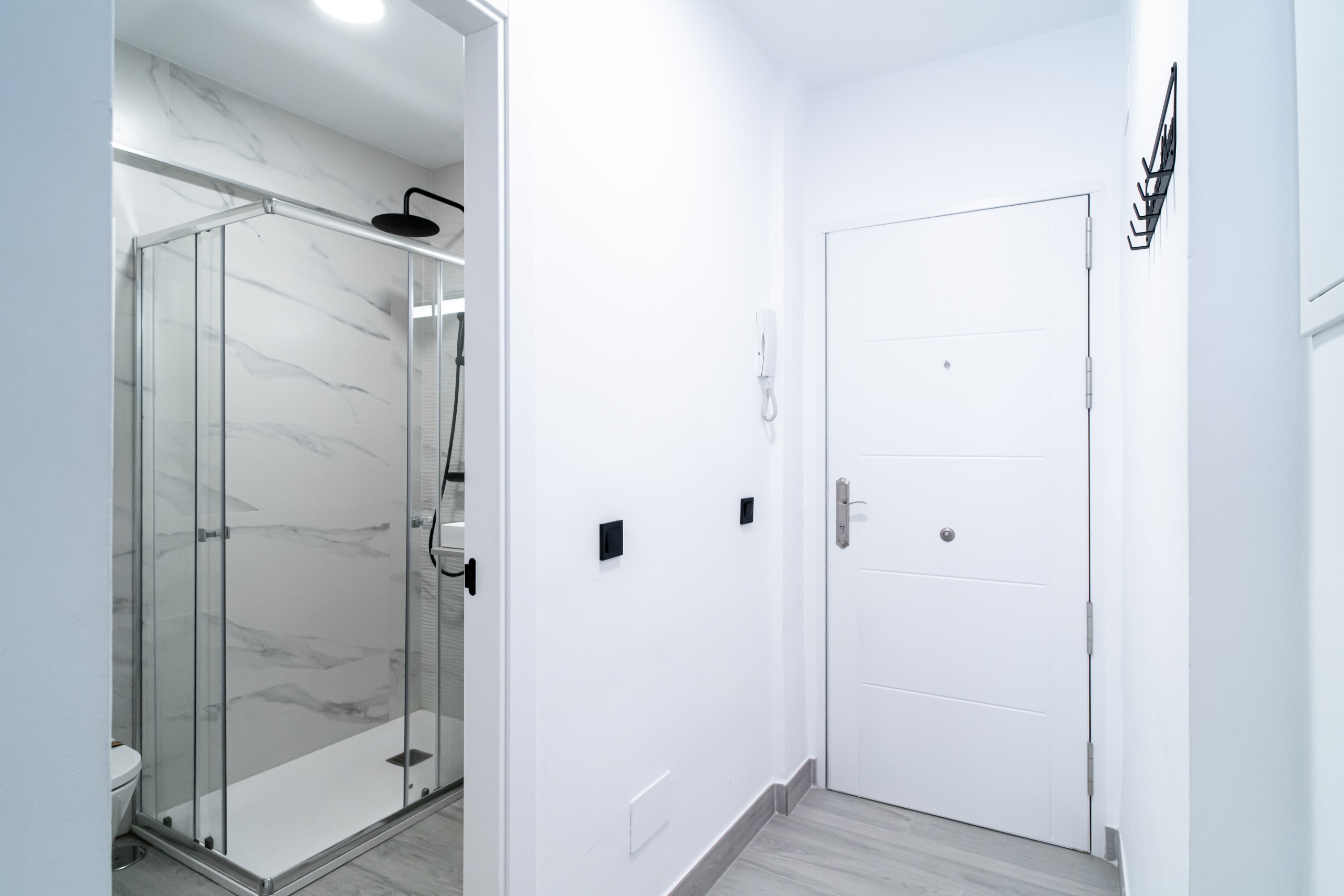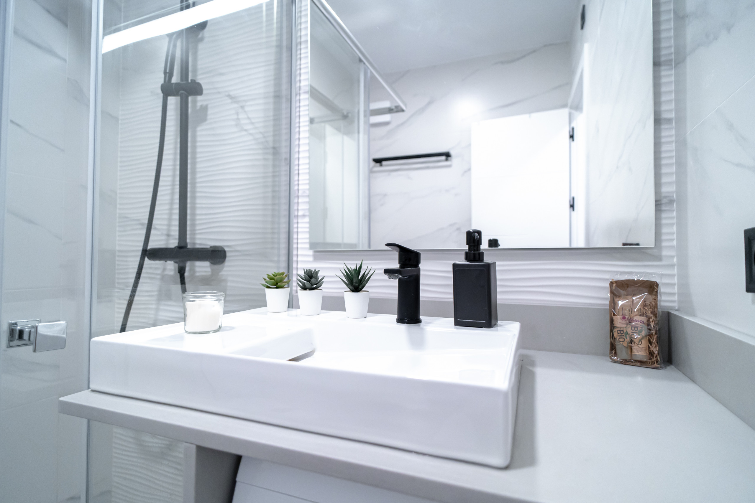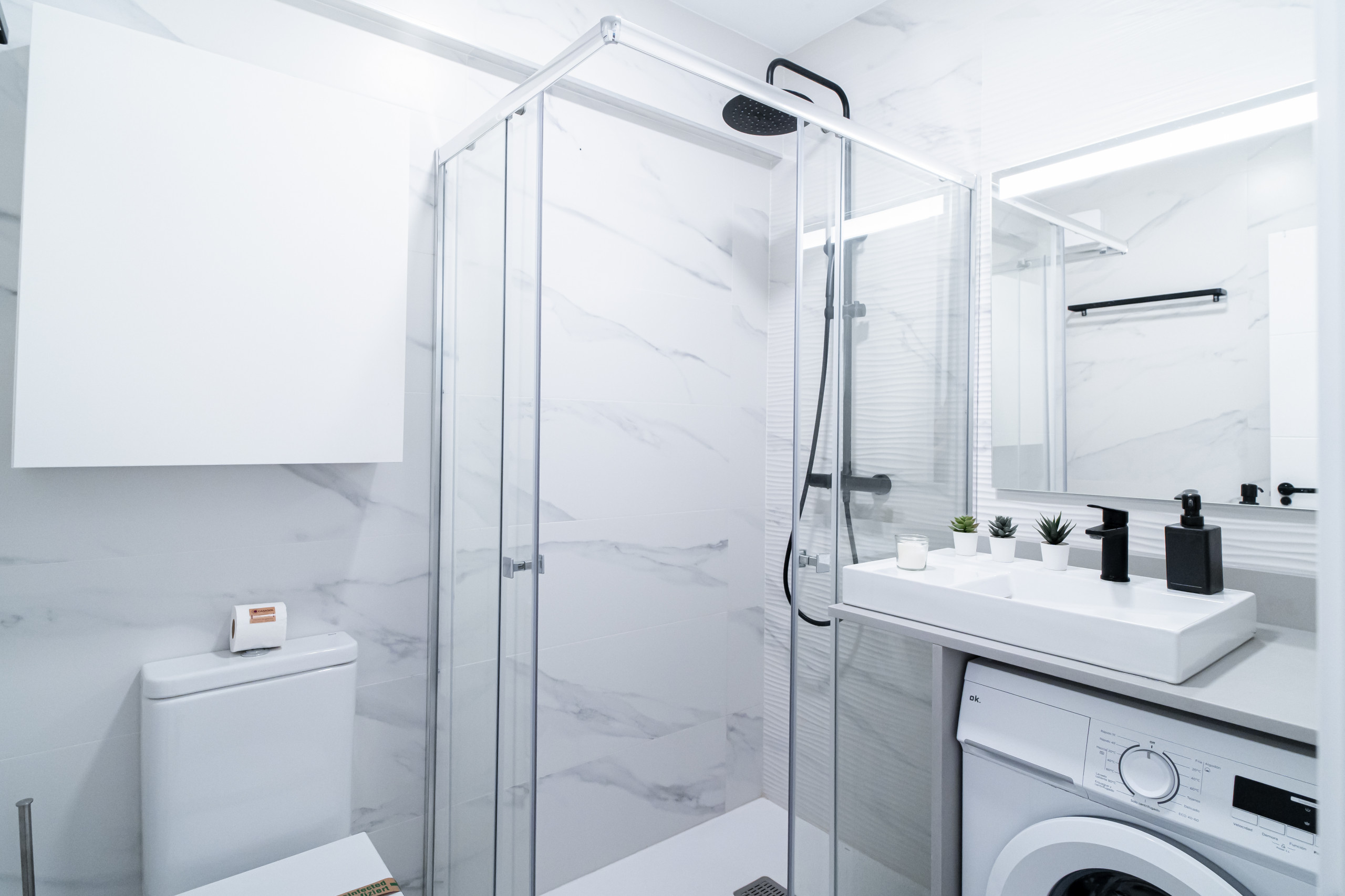 • Moderno cuarto de baño con ducha de diseño y todas las comodidades.