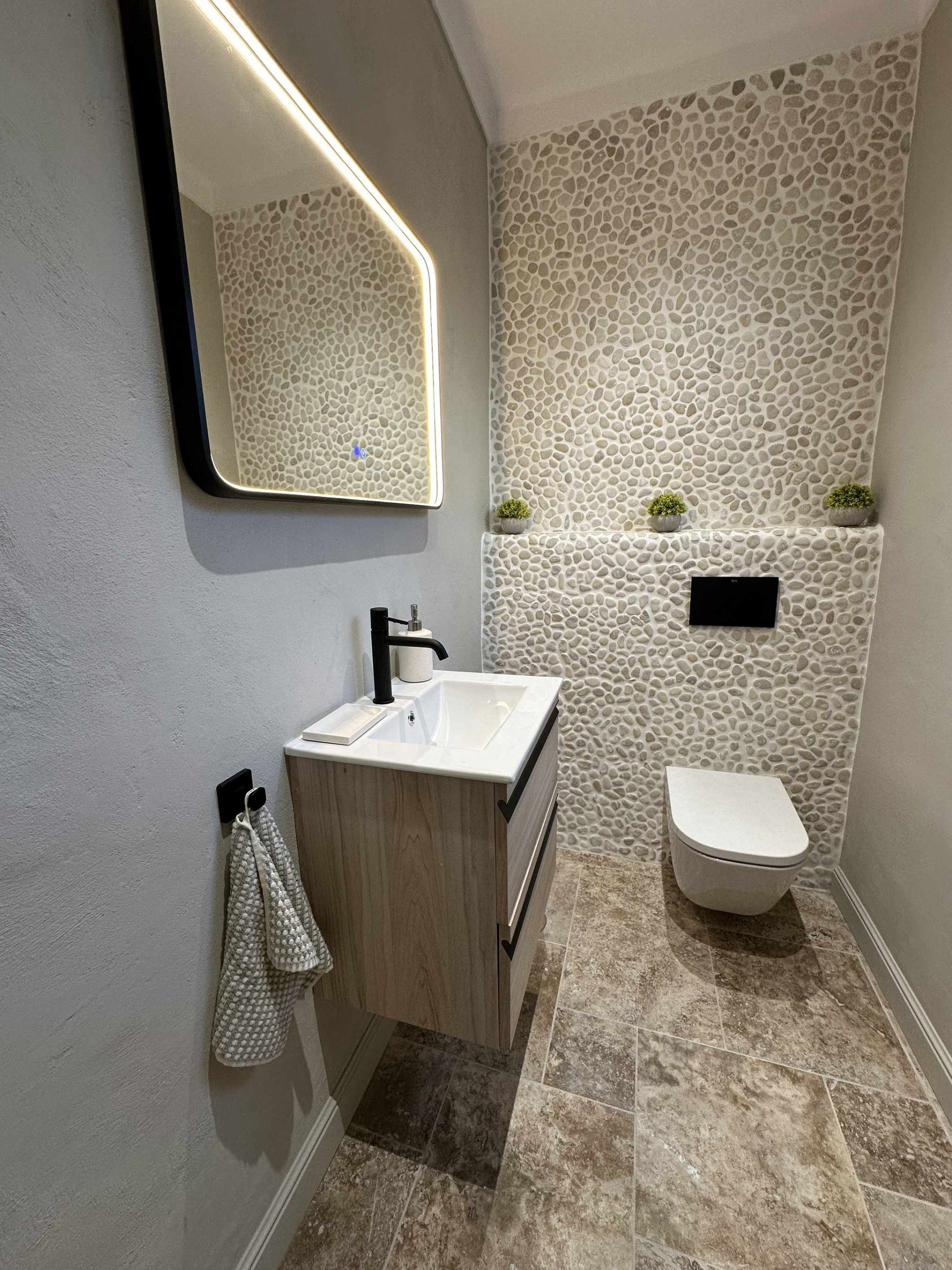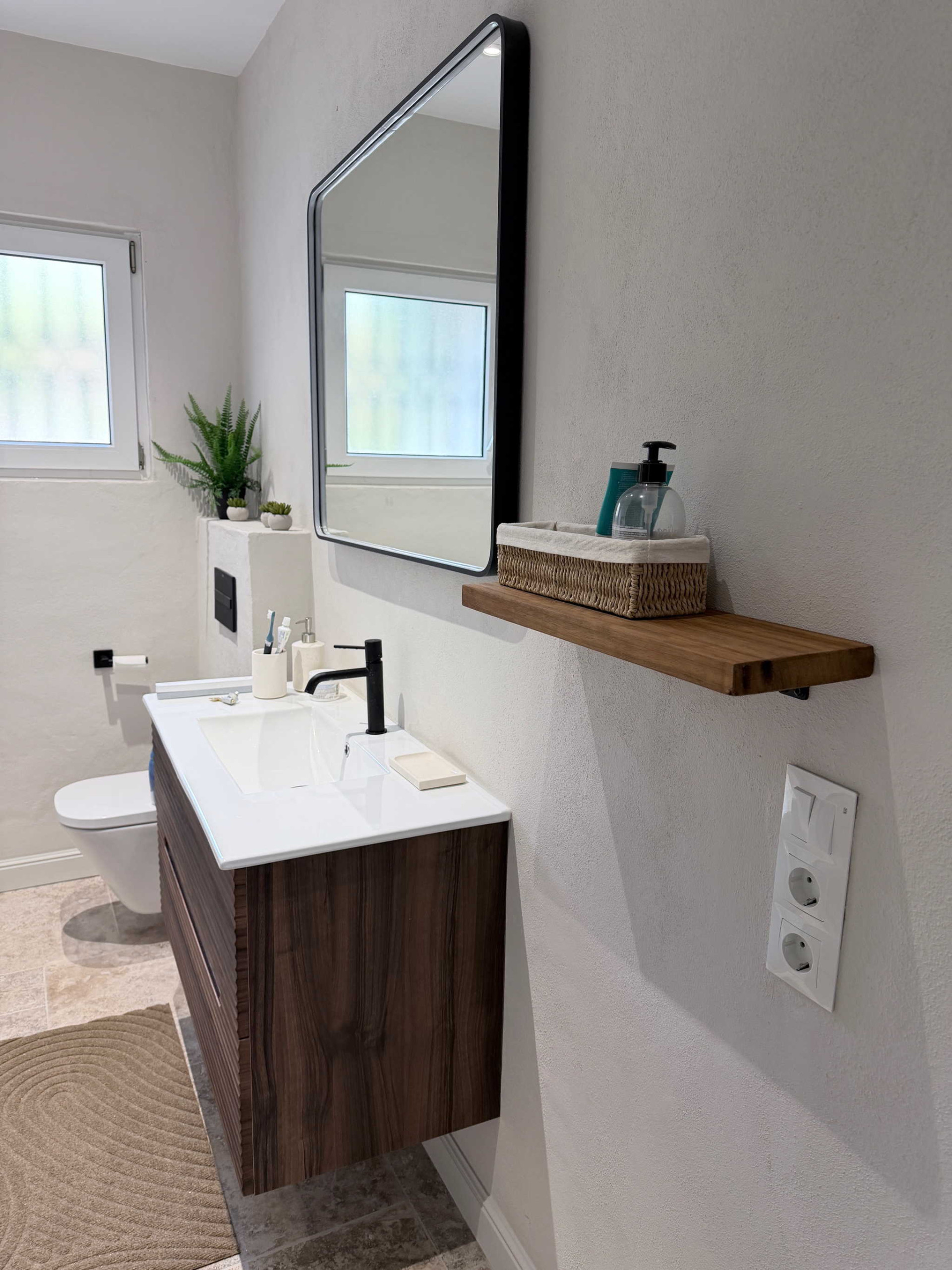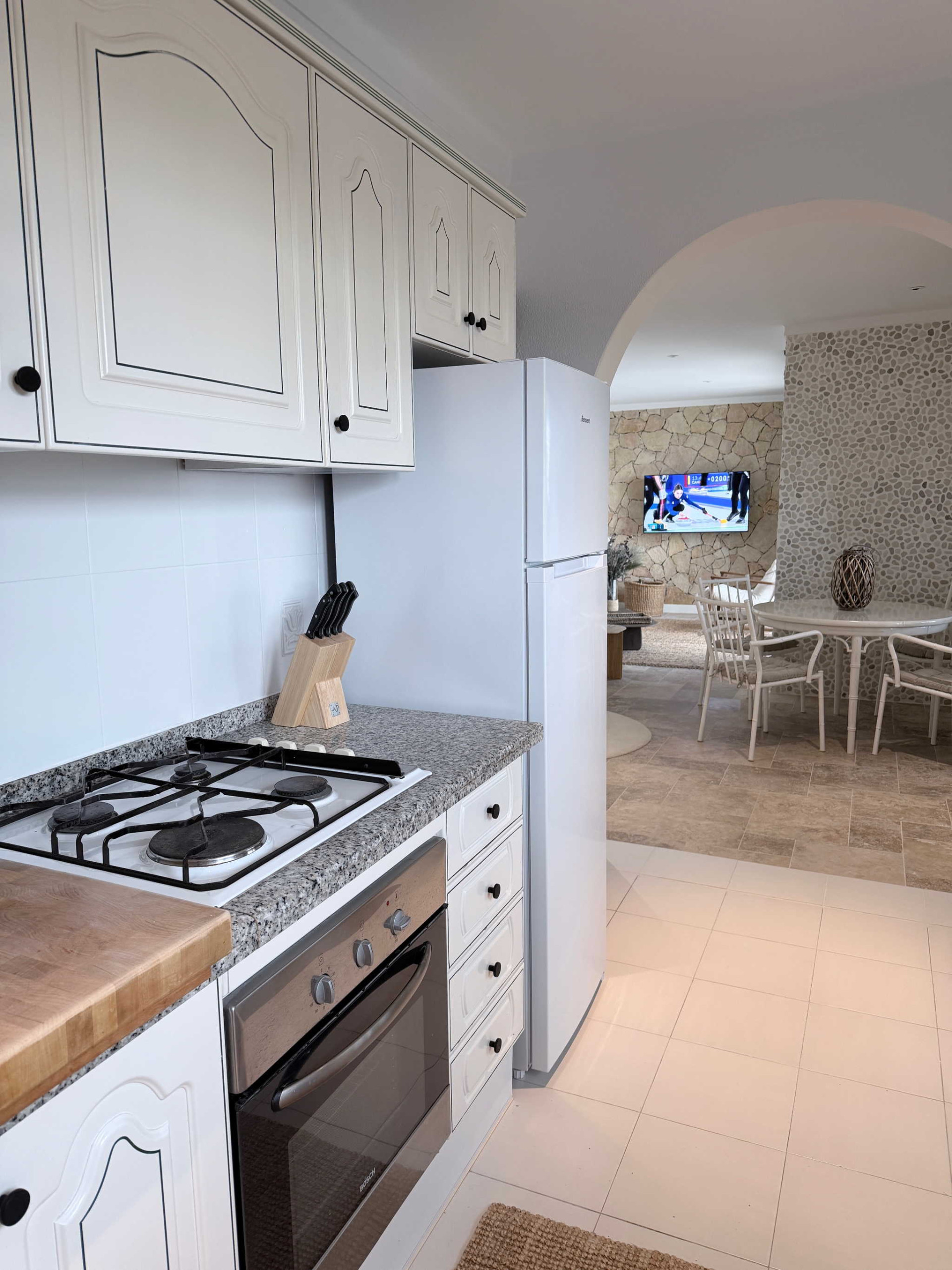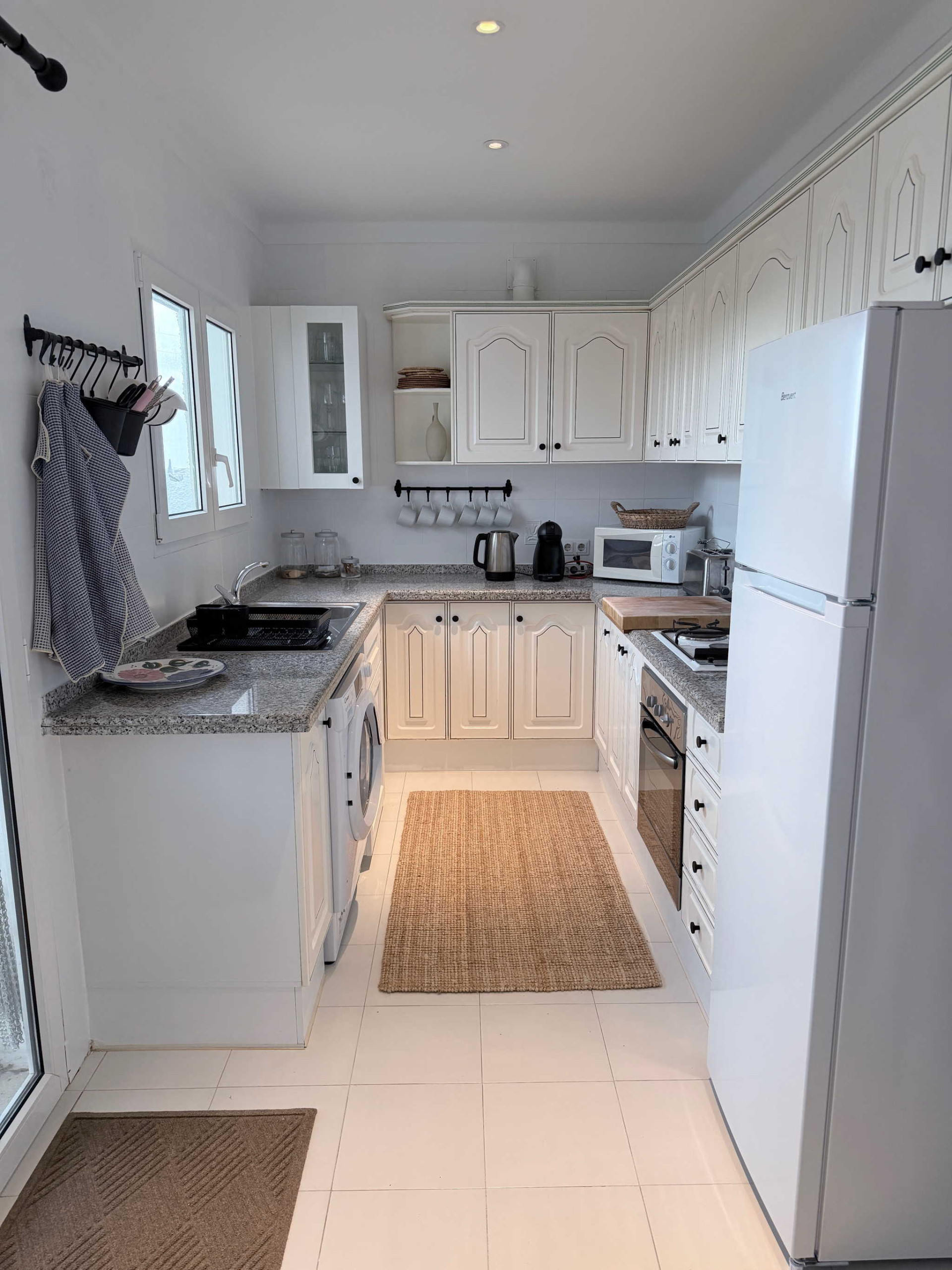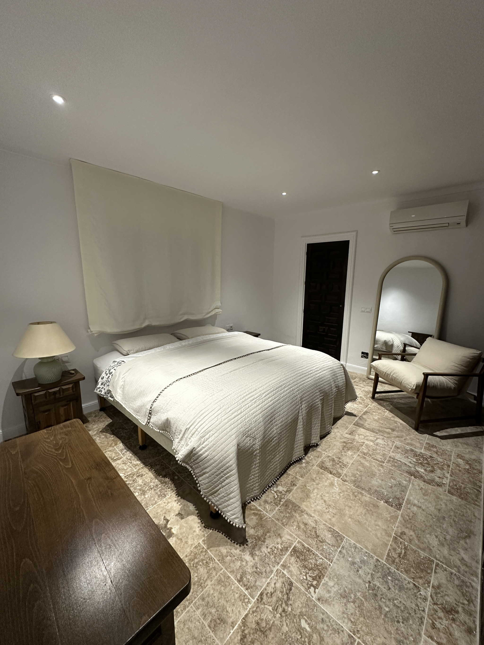 La distribución de la casa ha sido pensada para la comodidad de cuatro personas. Al entrar, un práctico aseo de cortesía da servicio a las zonas comunes. A la izquierda, se encuentra el primer dormitorio, equipado con cama doble de calidad y un baño en suite privado. El salón, decorado con un estilo contemporáneo y acogedor, conecta con una cocina semi-abierta totalmente equipada. Al otro lado de la estancia, el segundo dormitorio también cuenta con su propio baño en suite y cama de matrimonio. Esta configuración de "doble suite" garantiza que cada pareja o huésped tenga su propio espacio de intimidad sin compartir baño.
