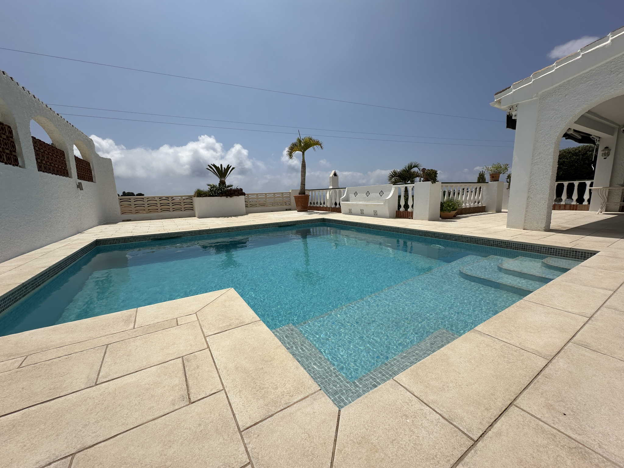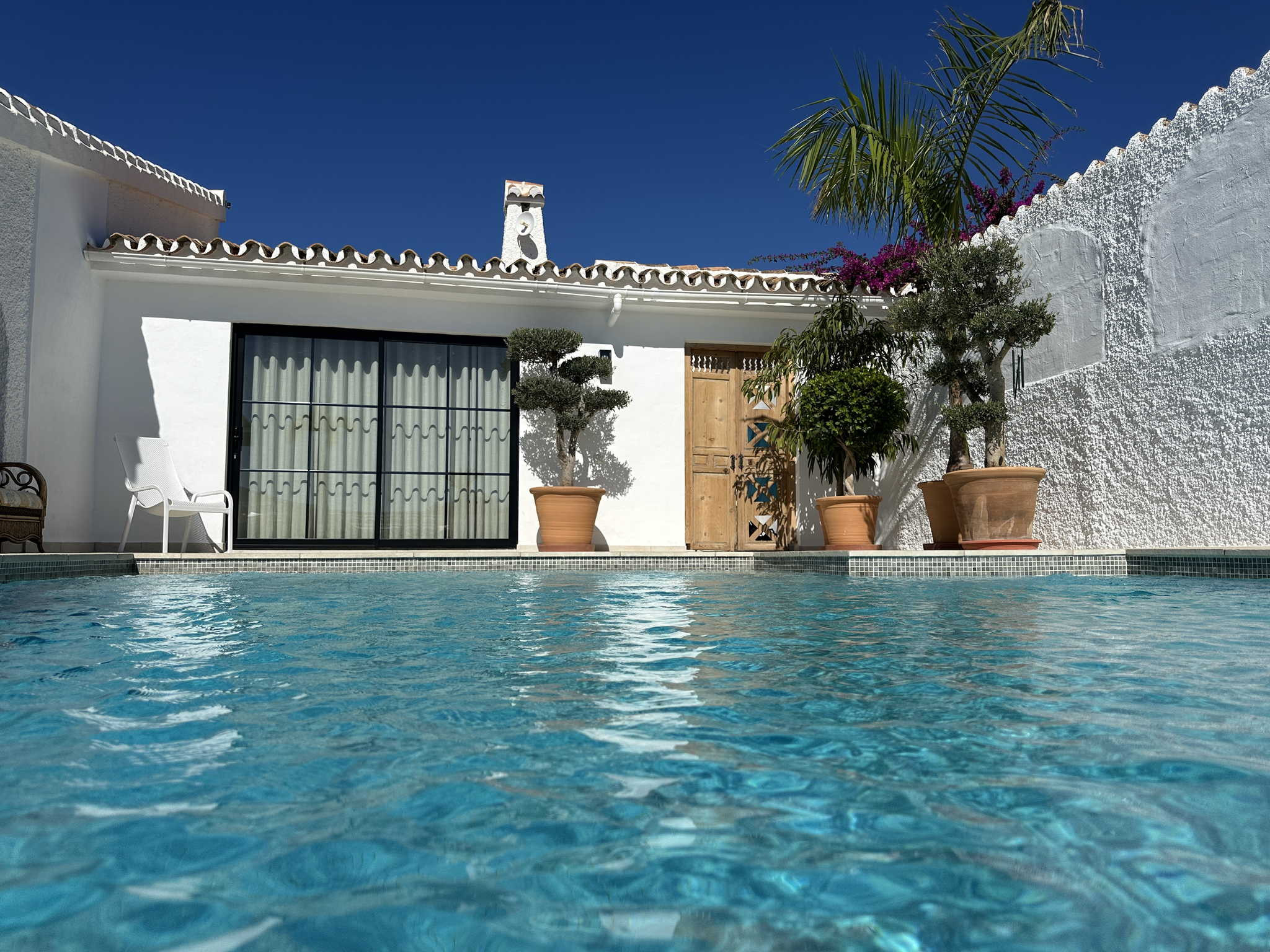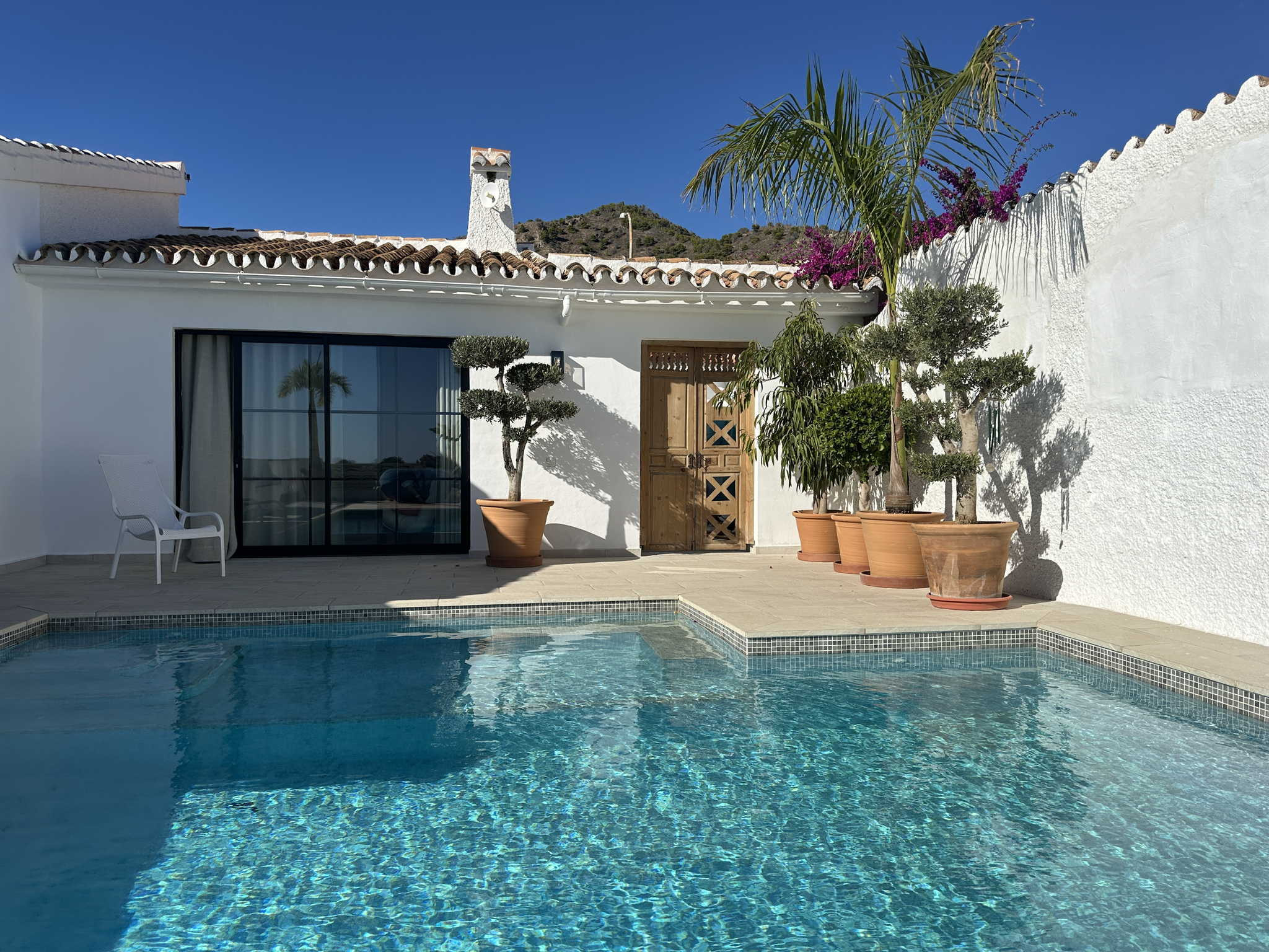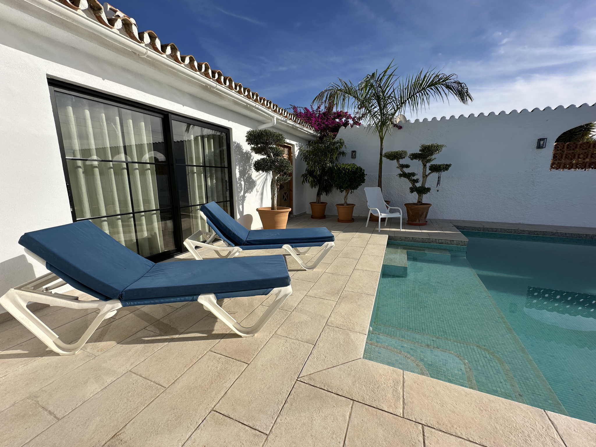 El exterior es el punto fuerte de la villa y está organizado para aprovechar cada metro cuadrado. Nada más salir al sol, encontrará la zona de piscina privada con vistas despejadas y un área de tumbonas. A la izquierda dispone de una cómoda ducha al aire libre y tendedero, mientras que a la derecha cuenta con una mesa de exterior para sus cenas al fresco. Bajando unos pocos escalones, accederá a una zona de jardín independiente que alberga una barbacoa de obra privada, el rincón perfecto para cocinar a la brasa con total independencia del área de baño.