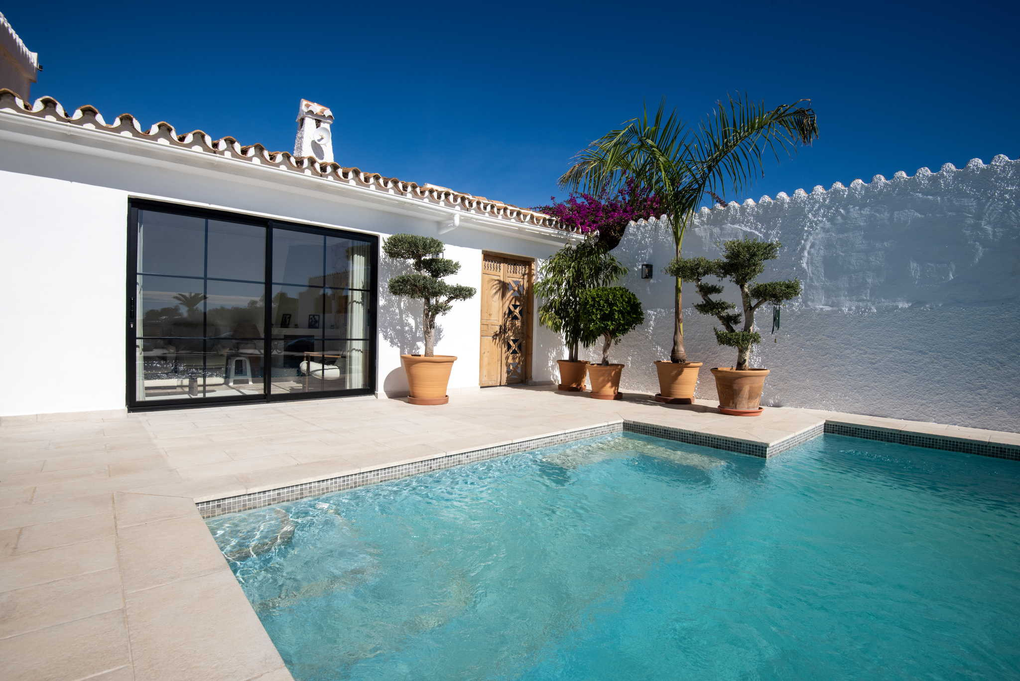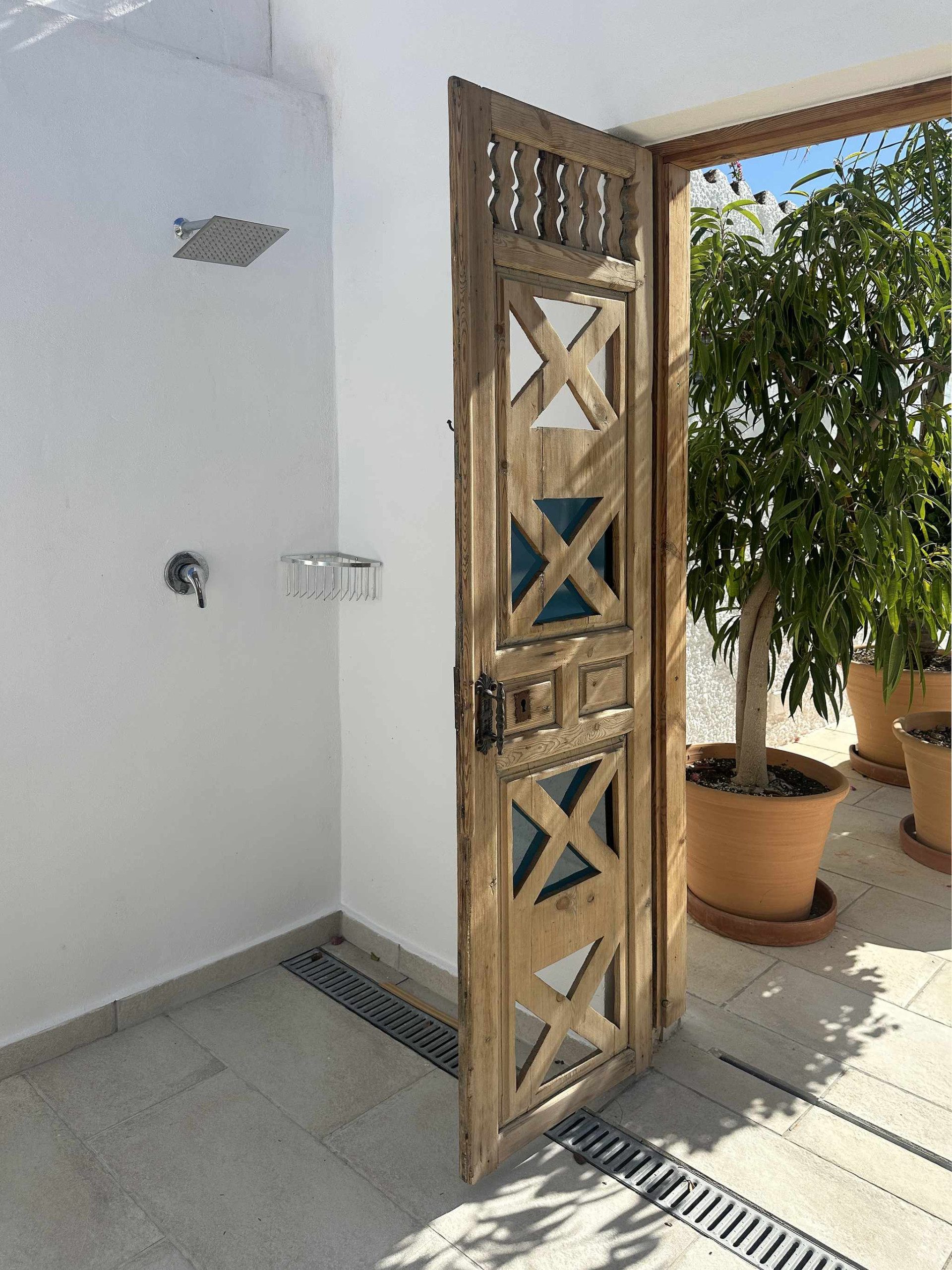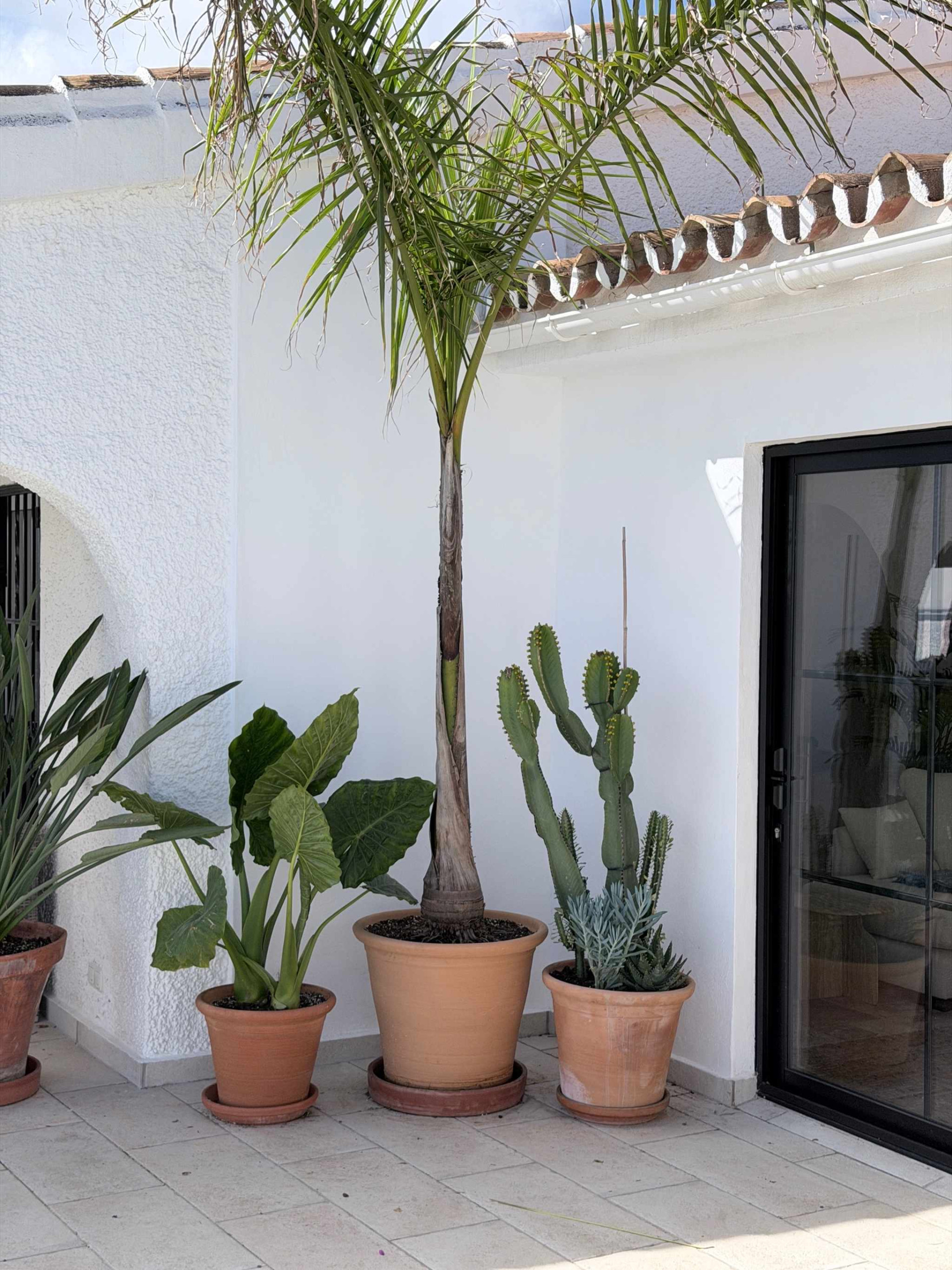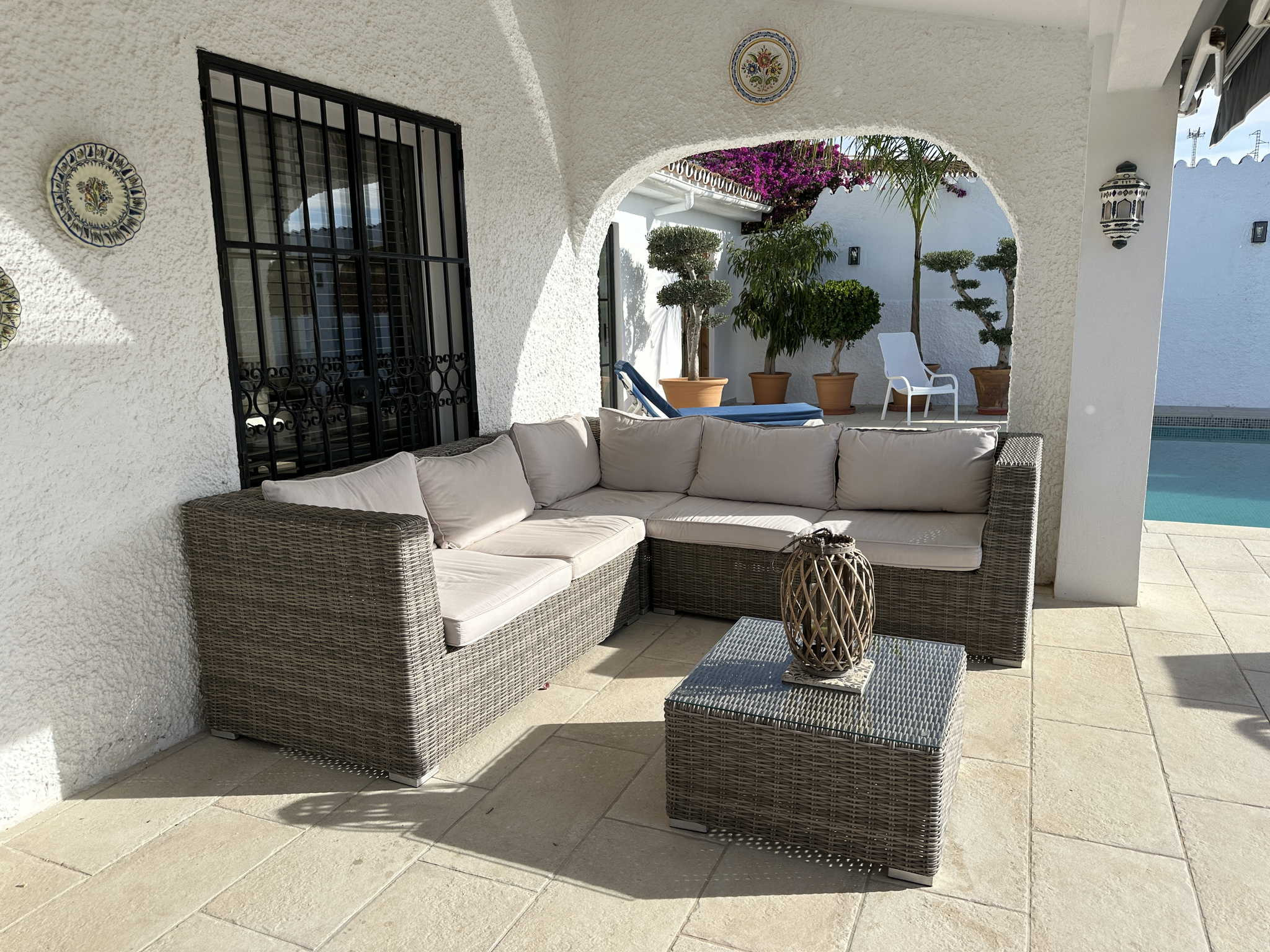 El exterior es el punto fuerte de la villa y está organizado para aprovechar cada metro cuadrado. Nada más salir al sol, encontrará la zona de piscina privada con vistas despejadas y un área de tumbonas. A la izquierda dispone de una cómoda ducha al aire libre y tendedero, mientras que a la derecha cuenta con una mesa de exterior para sus cenas al fresco. Bajando unos pocos escalones, accederá a una zona de jardín independiente que alberga una barbacoa de obra privada, el rincón perfecto para cocinar a la brasa con total independencia del área de baño.