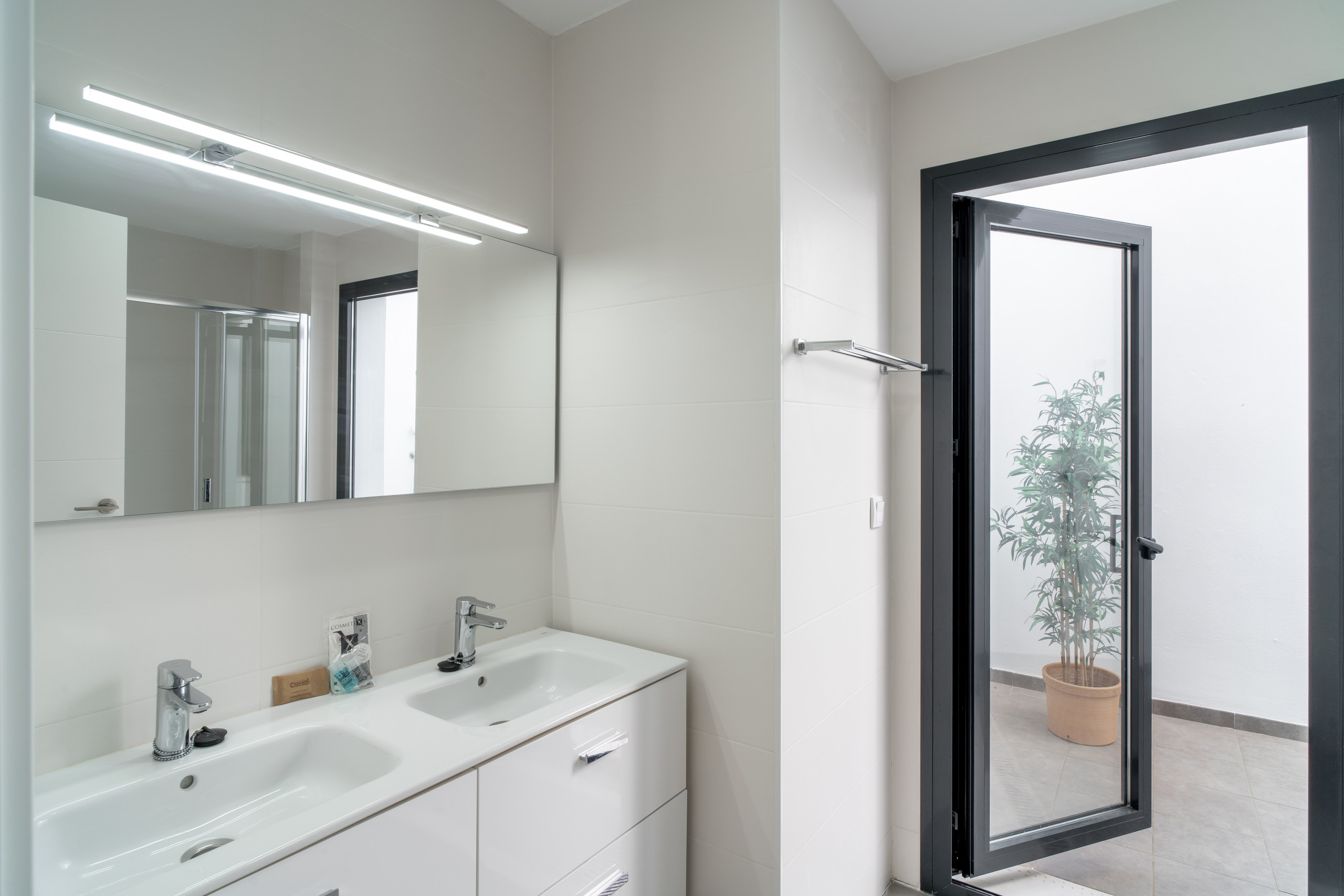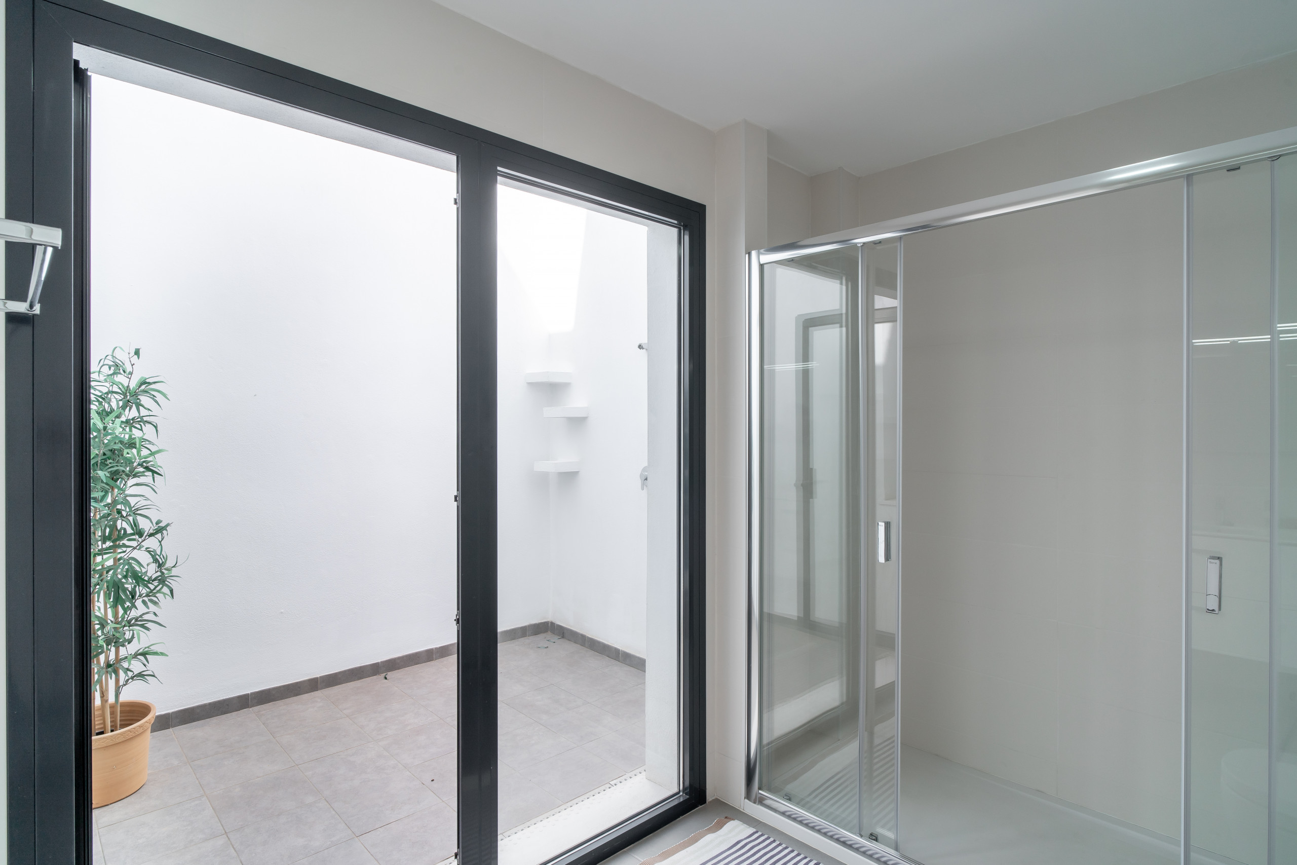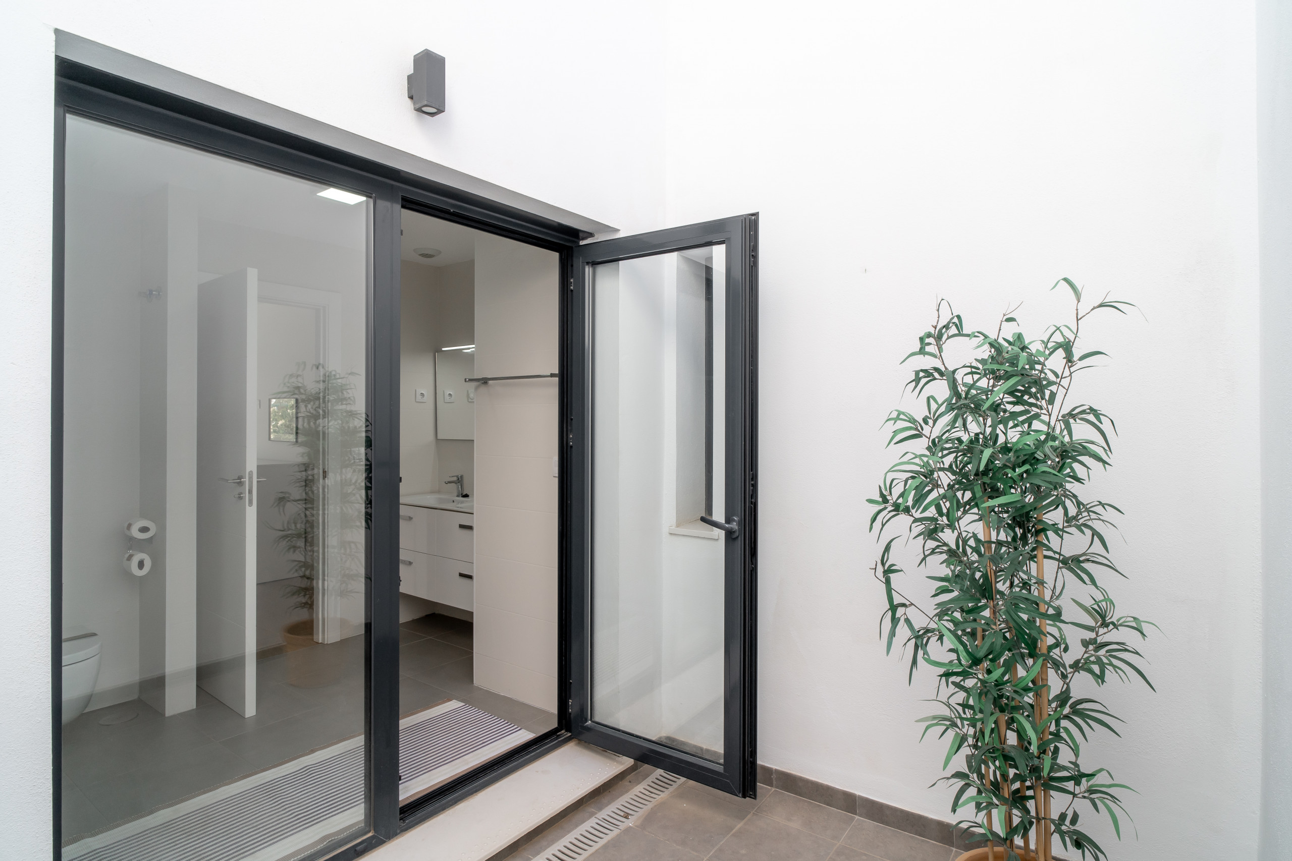 El cuarto de baño en suite con ducha exterior privada del dormitorio principal de la Villa Premium Los Mangos es lo último en lujo para quienes disfrutan de la sensación de la naturaleza y el aire libre. Esta experiencia única y vigorizante es perfecta para quienes buscan desconectar y relajarse en la intimidad mientras disfrutan del hermoso paisaje y el clima cálido de Nerja.