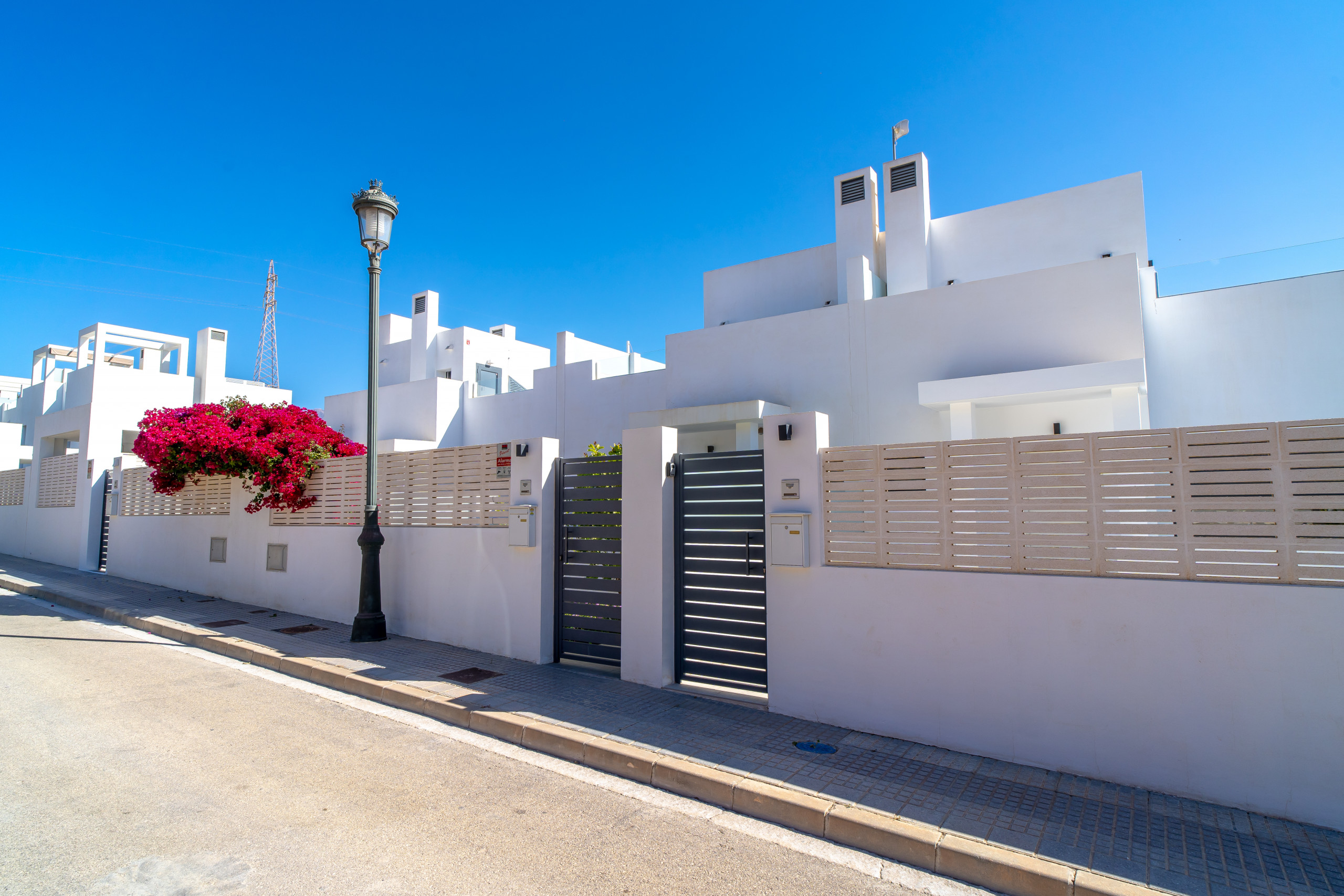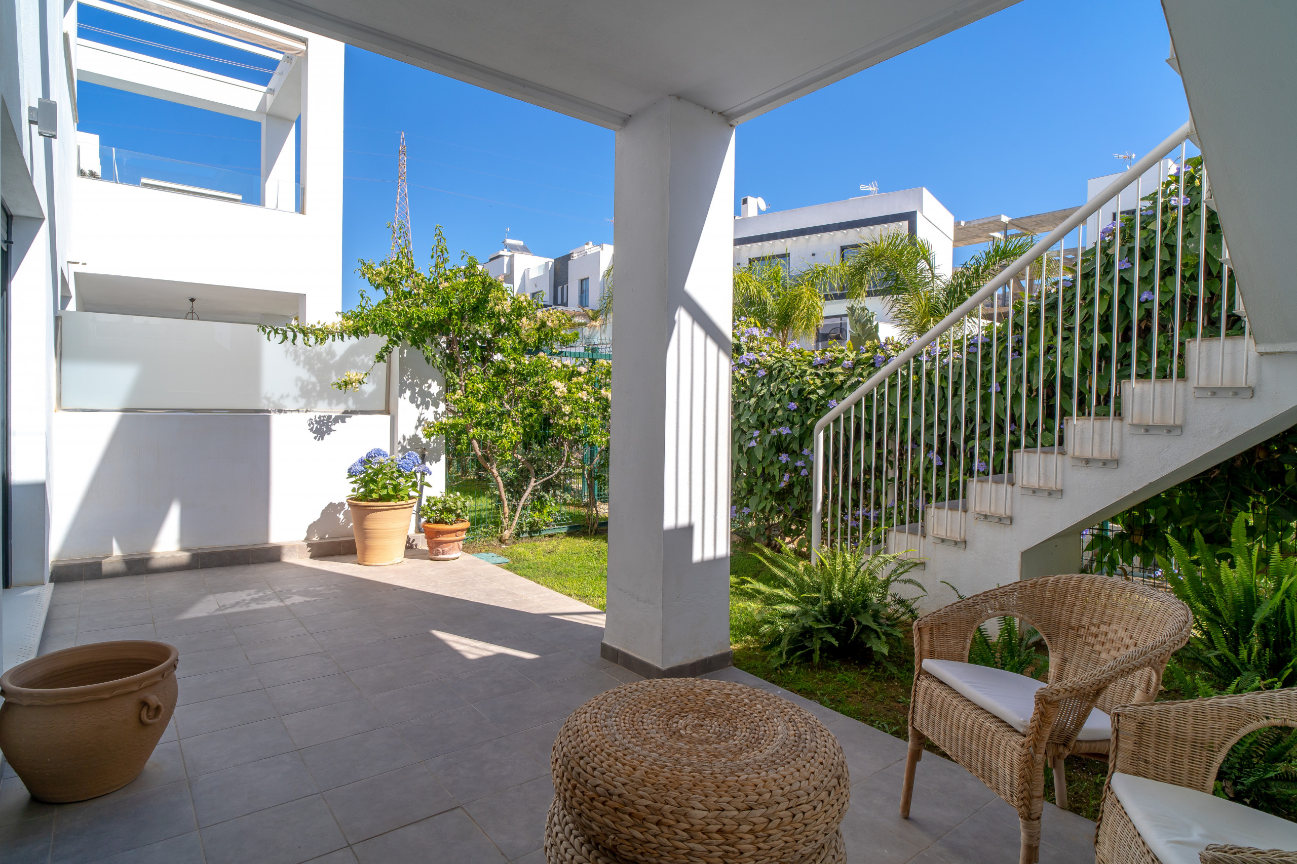 La villa se distribuye en 2 plantas, y en la planta de entrada hay un moderno salón y cocina, con electrodomésticos de última generación. Desde el salón se accede a una terraza con barbacoa, que conduce al jardín a través de una escalera exterior y a la piscina comunitaria.