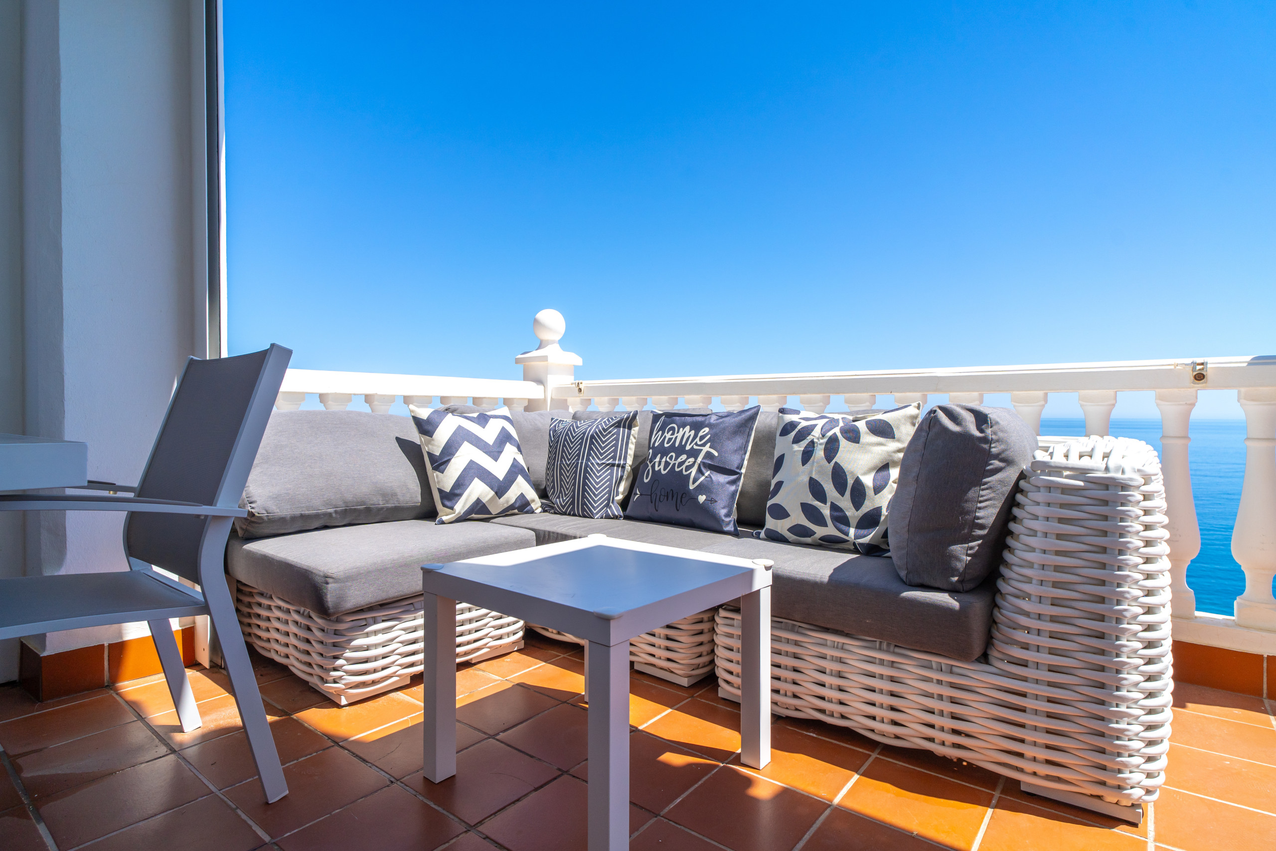 El dormitorio principal cuenta con baño en suite y balcón privado con sillones y unas increíbles vistas al mar, un lugar perfecto para empezar o terminar el día en paz.