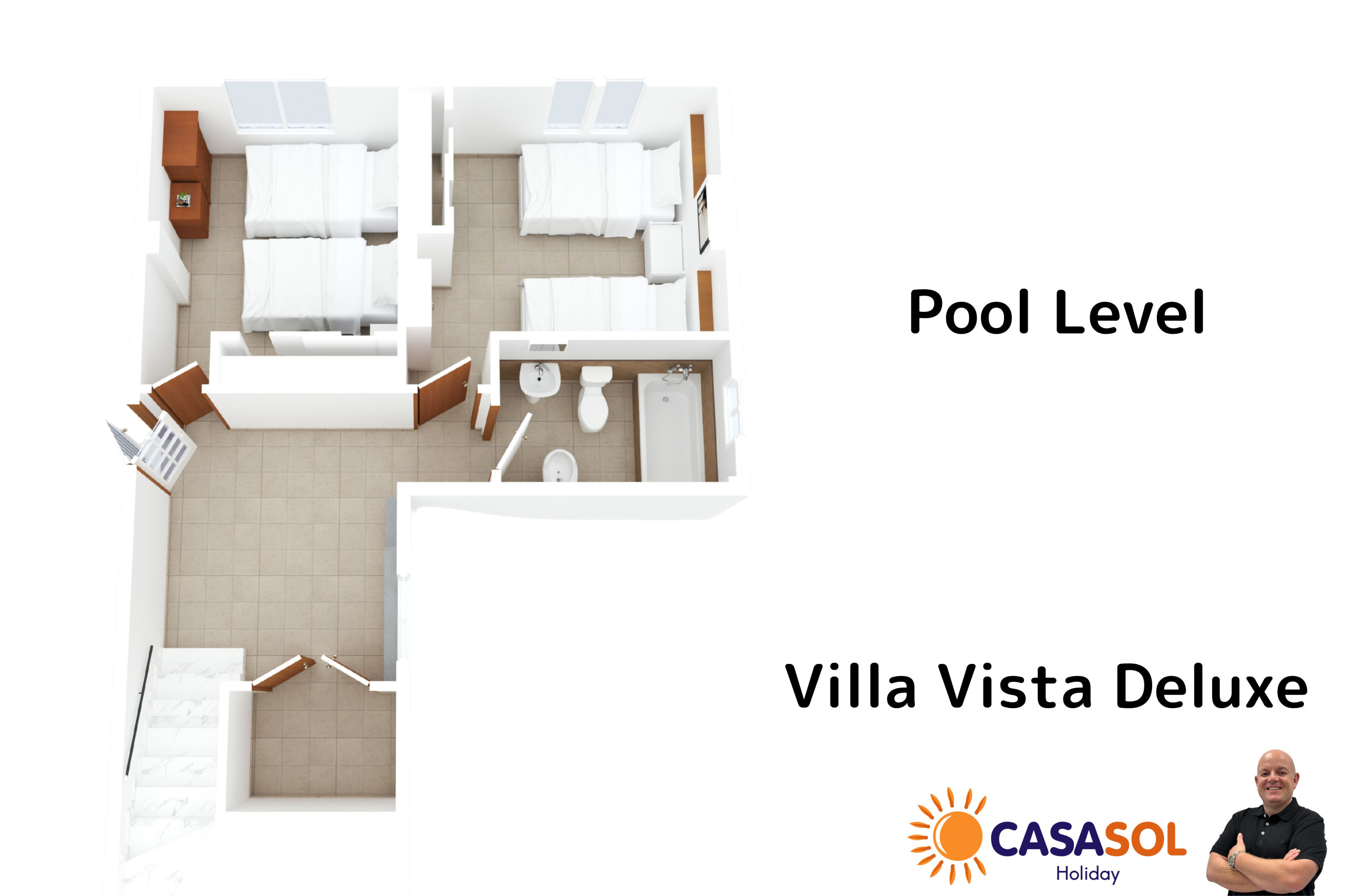 Con 150 m² de superficie habitable, la villa cuenta con tres elegantes dormitorios con capacidad para seis personas, incluyendo una lujosa cama king-size y cuatro camas individuales.