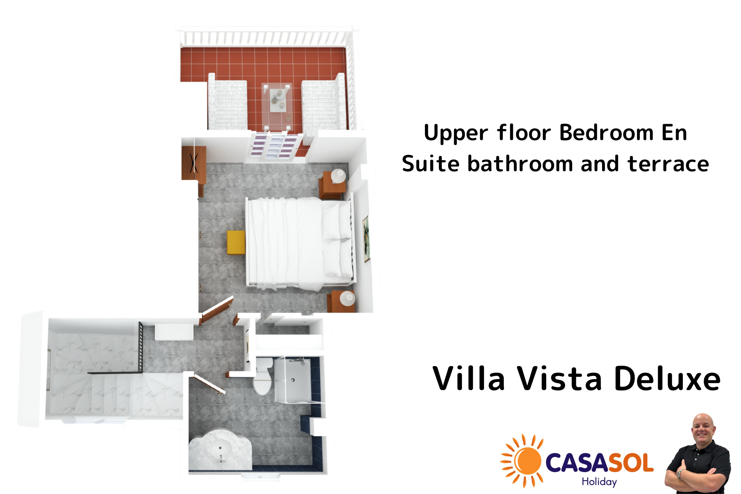 La villa también incluye dos modernos cuartos de baño (uno en suite) y un aseo adicional para invitados, lo que ofrece comodidad y privacidad para todos.